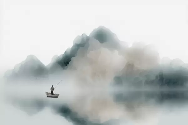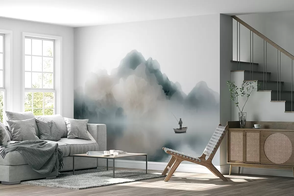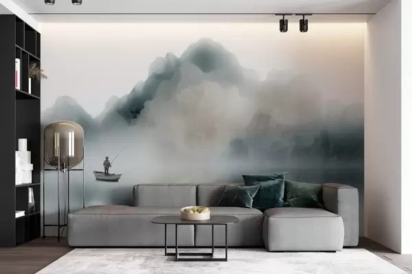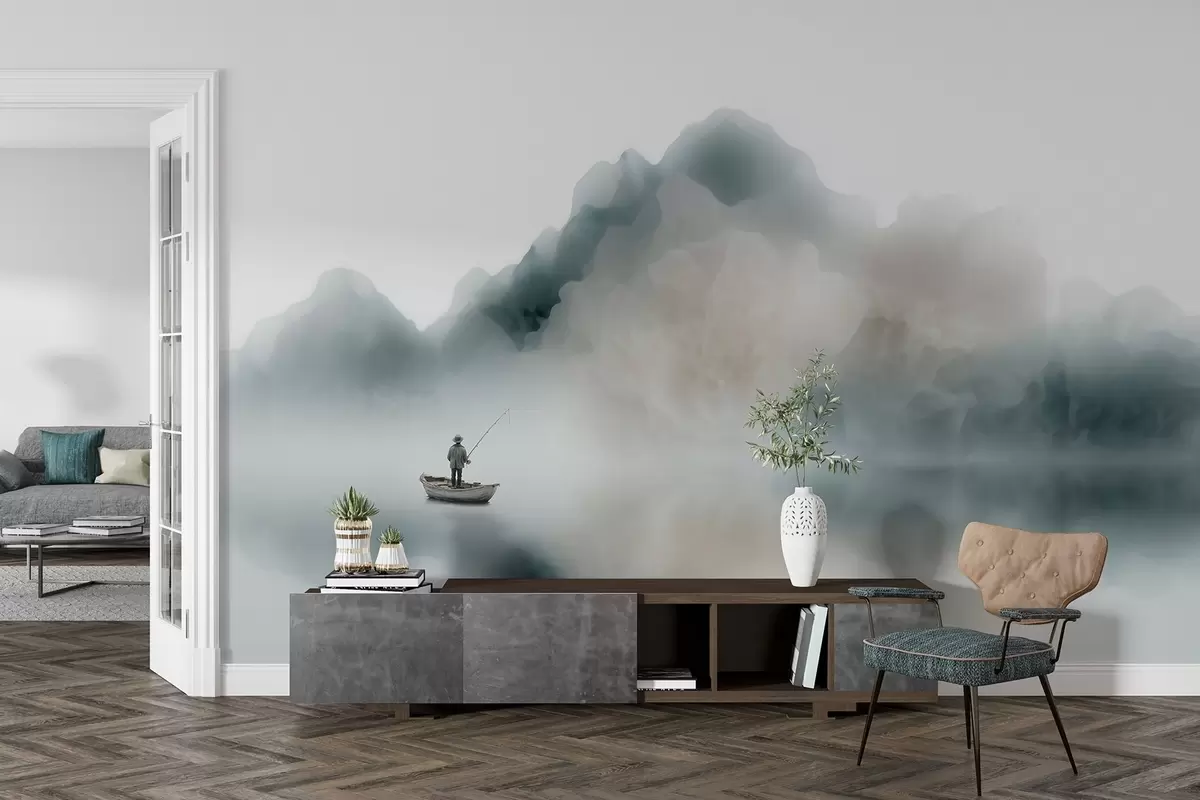 Фототапет Планински пейзаж с лодка и рибар, които се разтварят в мека мъгла Nr w09678
