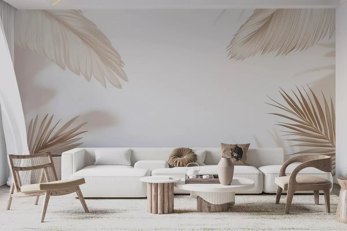 Фототапет Бежов тропически декор със силуети на палмови листа и меки сенки Nr w09714