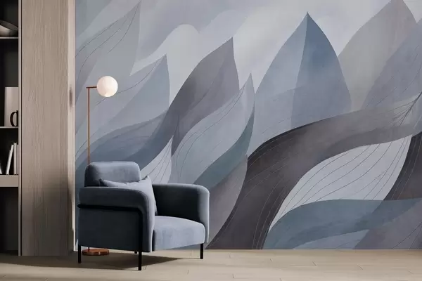 Фототапет Абстрактни листа, приглушени земни нюанси на синьо с деликатни линии, мека акварелна текстура Nr w09736v1