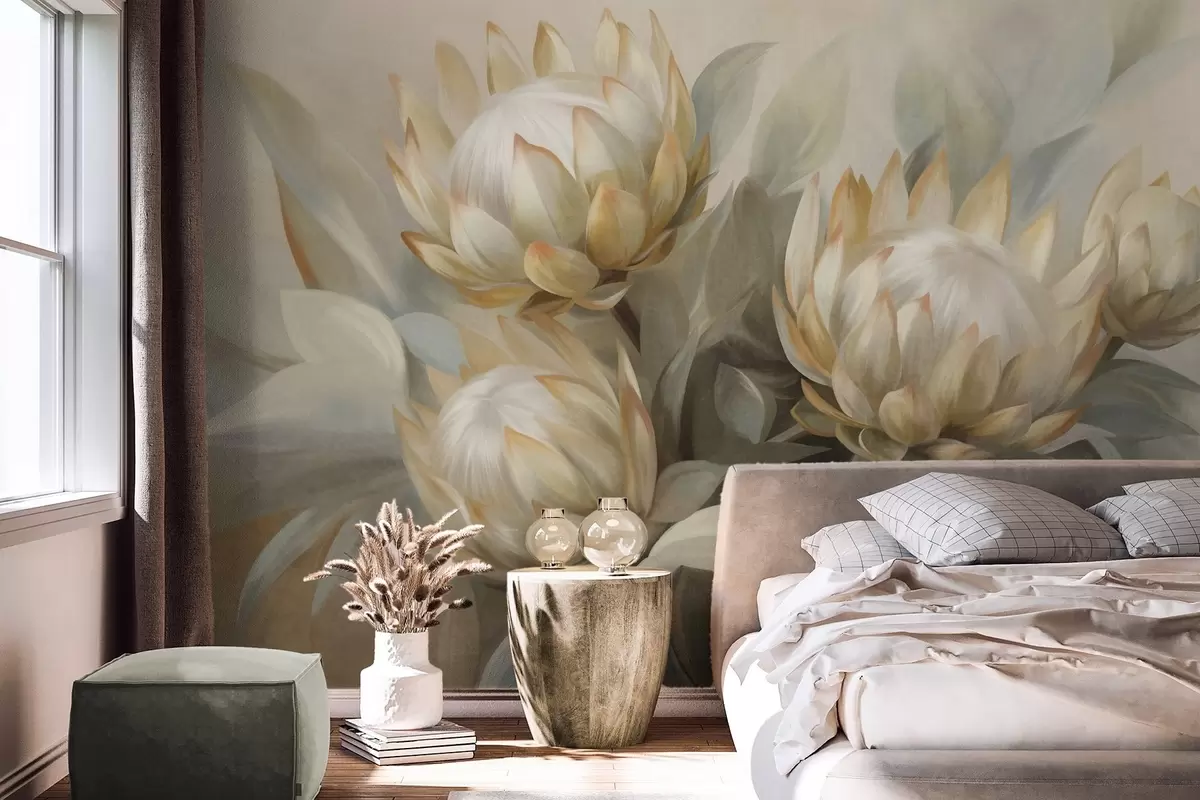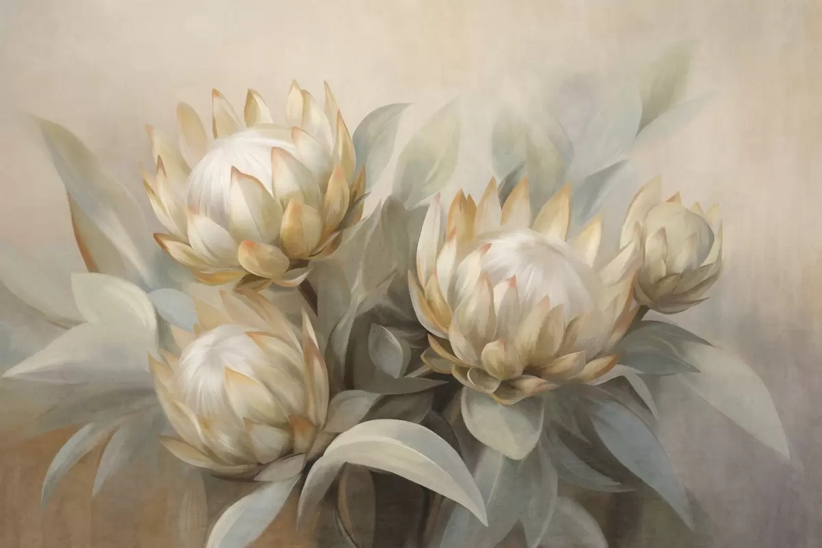Фототапет Текстурирани цветя протея със зелени листа и мек, размазан фон Nr w09738