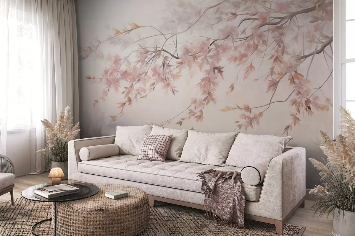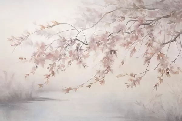 Фототапет Текстуриран пейзаж с клон от черешово дърво, розови листа, мек, мъглив фон Nr w09743