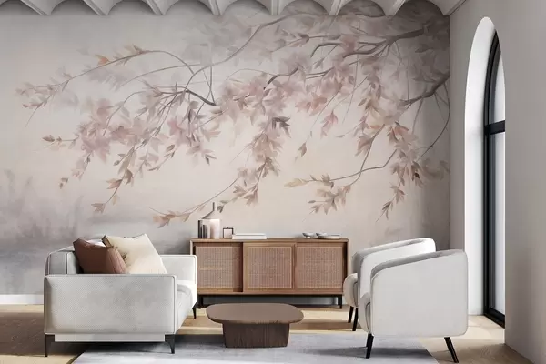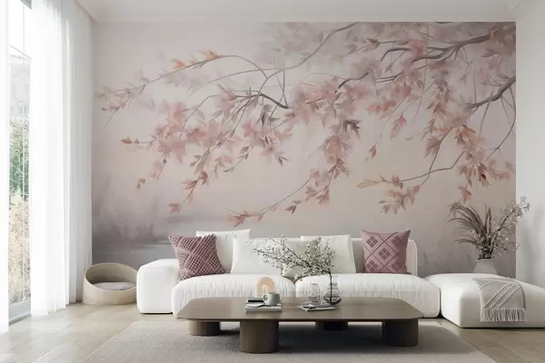 Фототапет Текстуриран пейзаж с клон от черешово дърво, розови листа, мек, мъглив фон Nr w09743