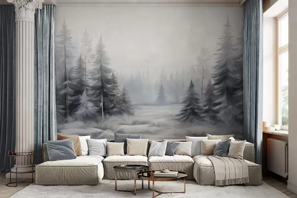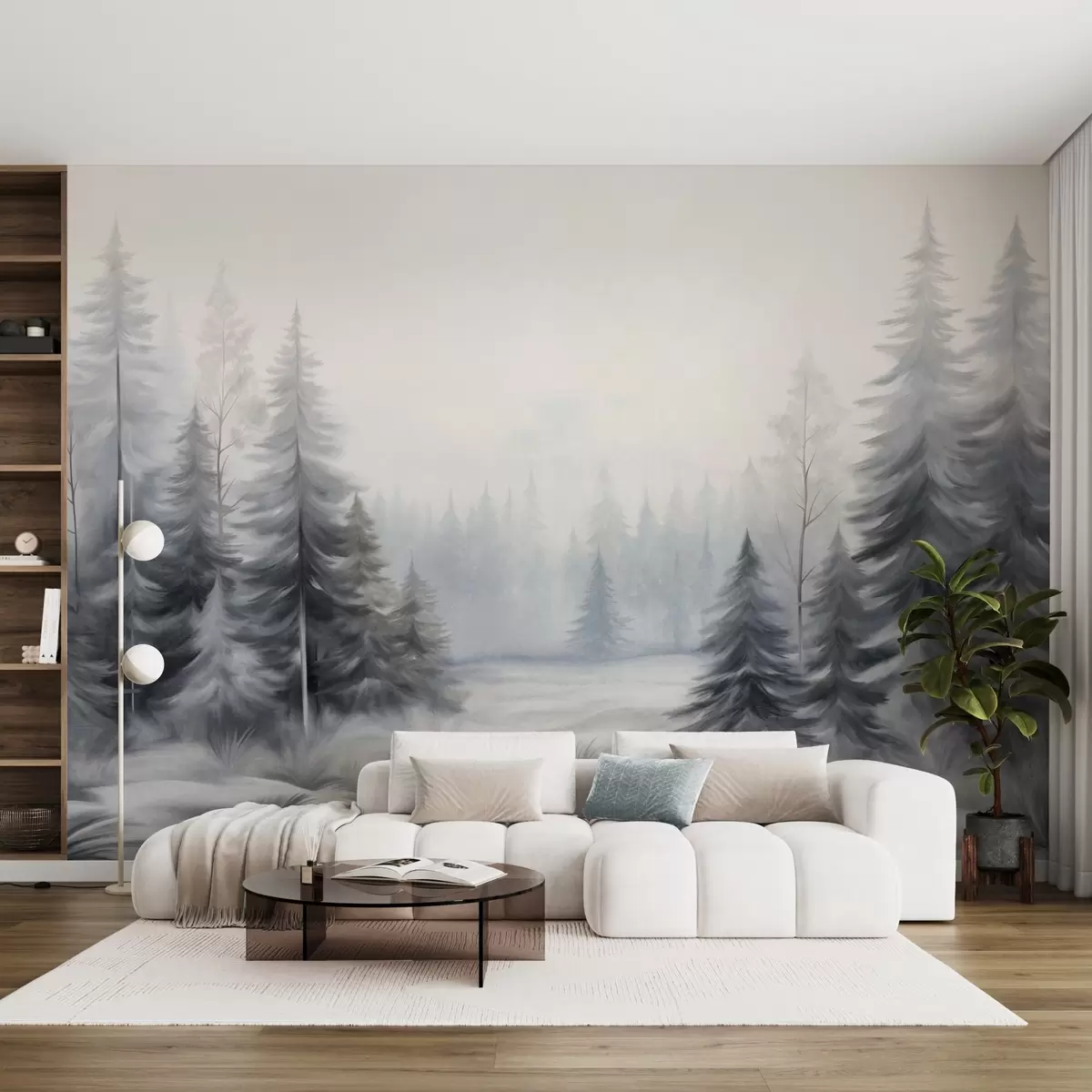 Фототапет Текстурирани зимни горски дървета в мъгла, в приглушени сиви и бели тонове Nr w09745