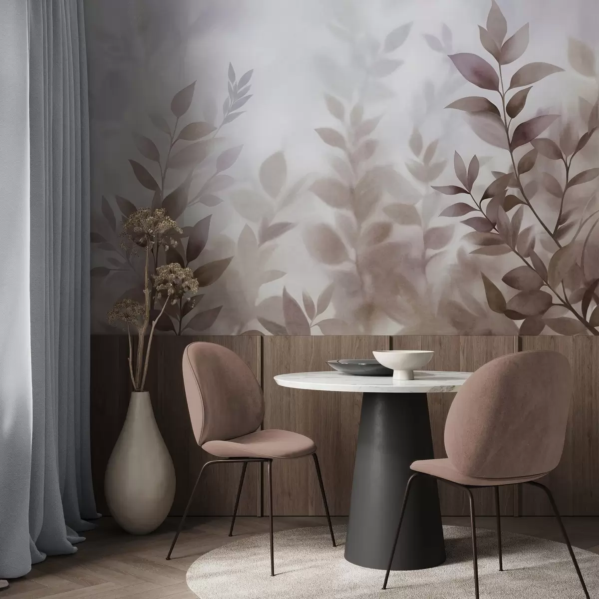 Фототапет Деликатни клони с приглушени кафяви и бежови листа, стил на акварелна живопис, текстурирано изкуство Nr w09750