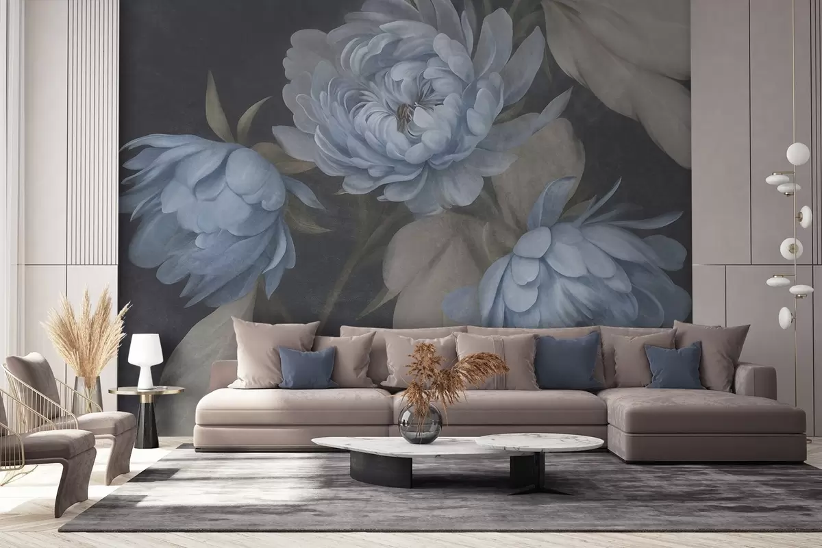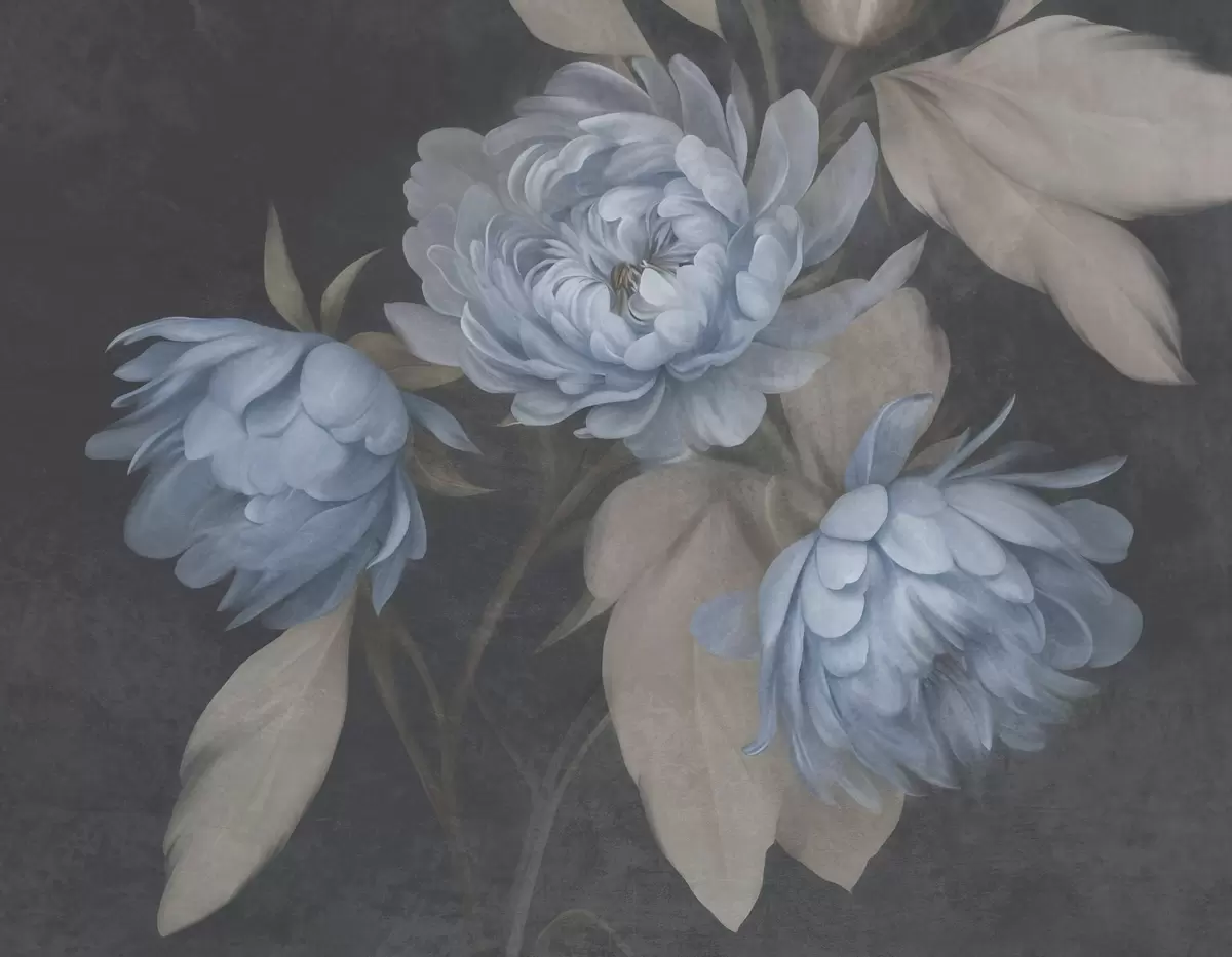 Фототапет Текстурирани светлосини цветове на божур с бежови листа на тъмен фон Nr w09751