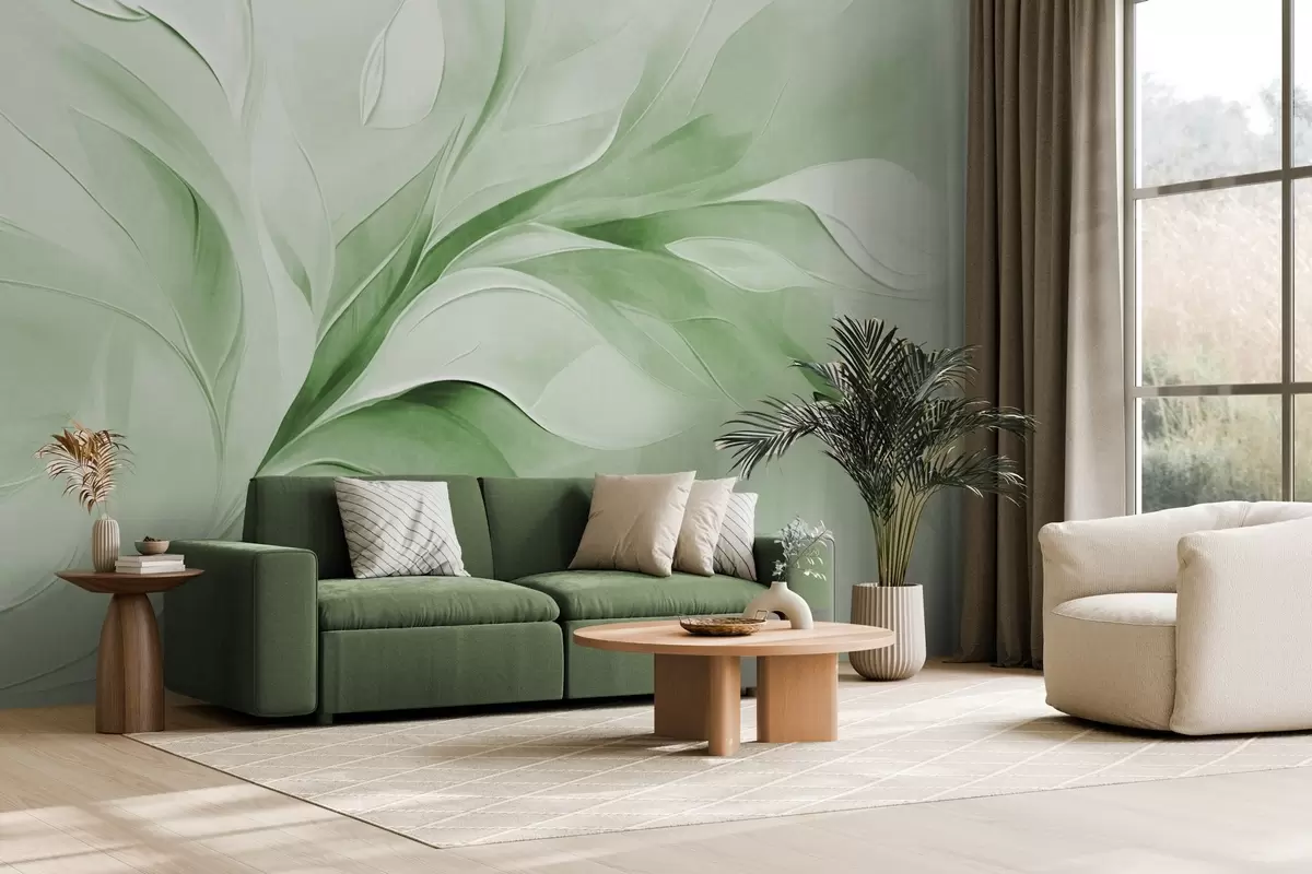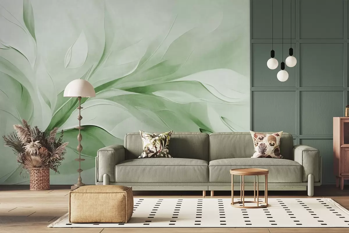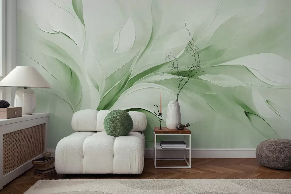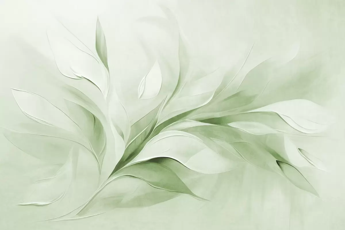 Фототапет Абстрактен стил на рисуване с текстура от зелени и бели плаващи листа Nr w09765v2
