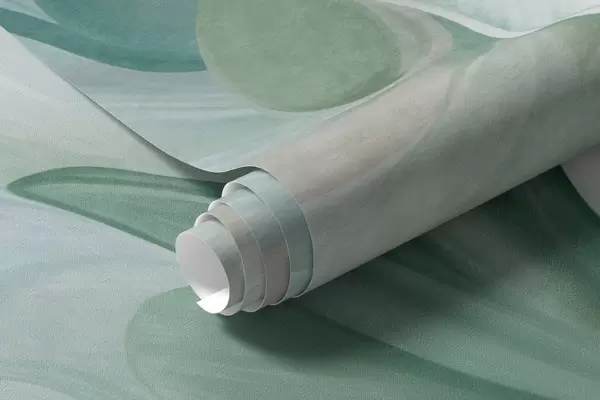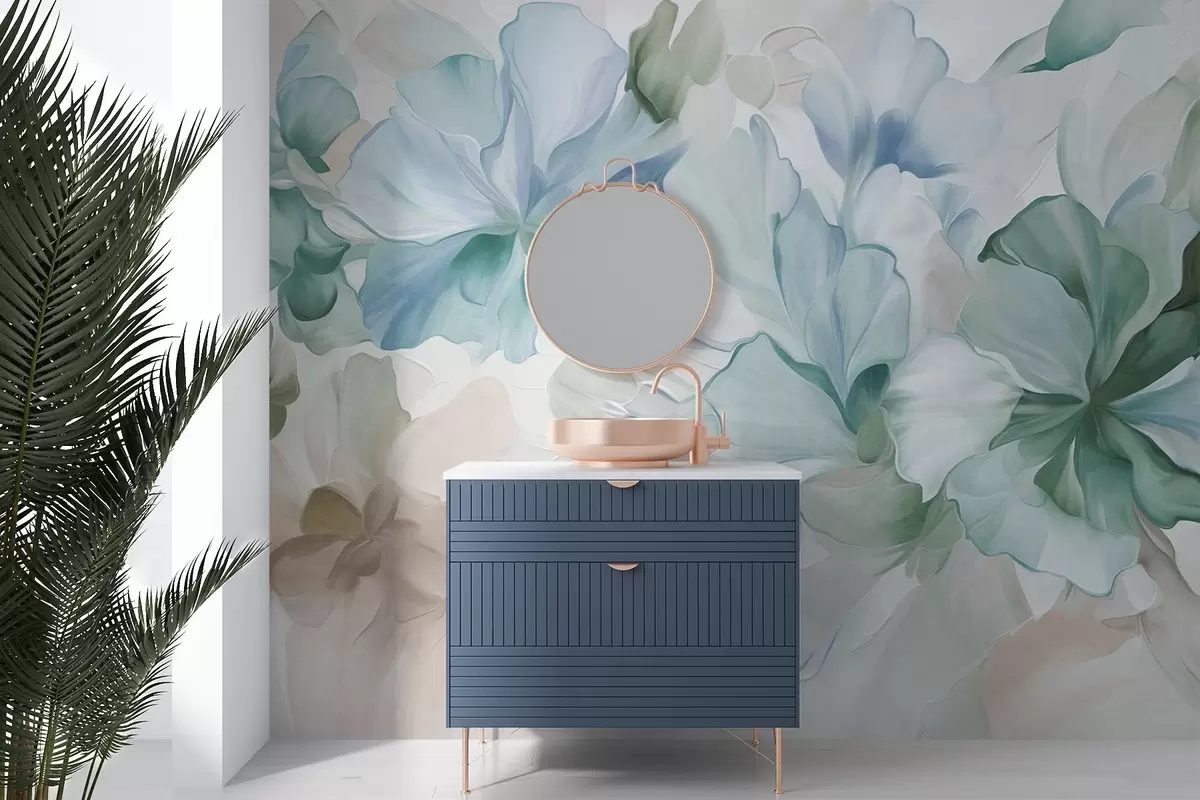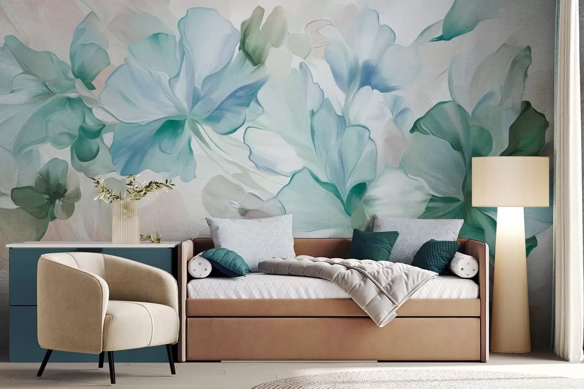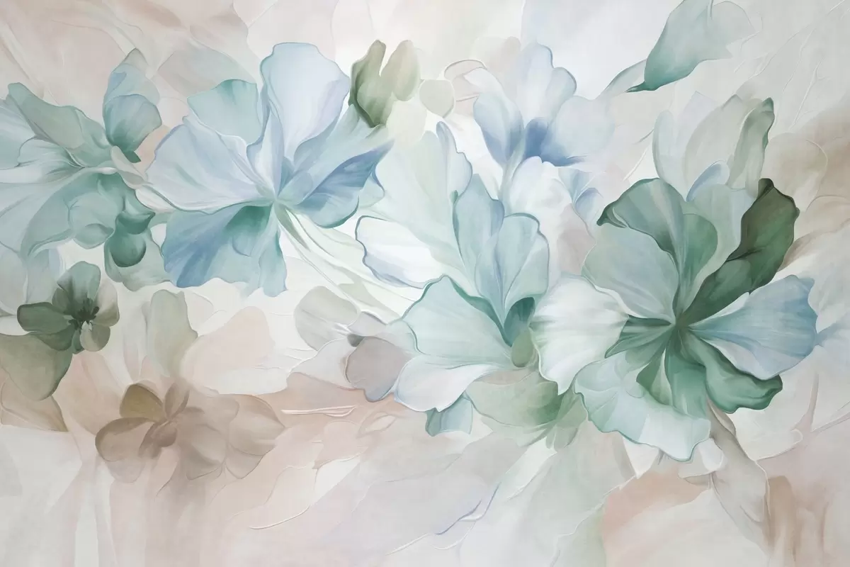 Фототапет Абстрактни фантазийни цветя в нюанси на зелено, синьо и бежово, изработени в стила на живописта, с текстуриран ефект Nr w09767v1