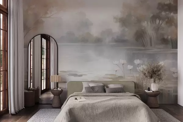 Фототапет Пейзаж с релеф, езеро с бели водни лилии, заобиколено от дървета в пастелни цветове Nr w09768