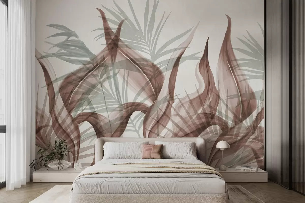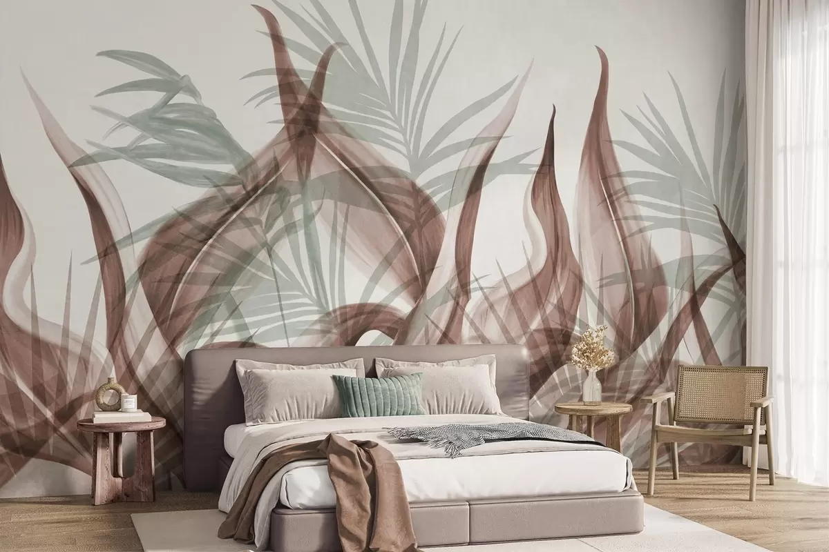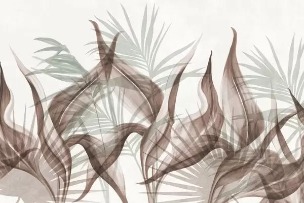 Фототапет Тропически листа в кафяви и зелени нюанси на бял фон, текстурирани в акварелен стил Nr w09772