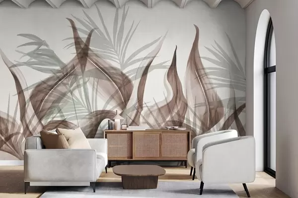 Фототапет Тропически листа в кафяви и зелени нюанси на бял фон, текстурирани в акварелен стил Nr w09772