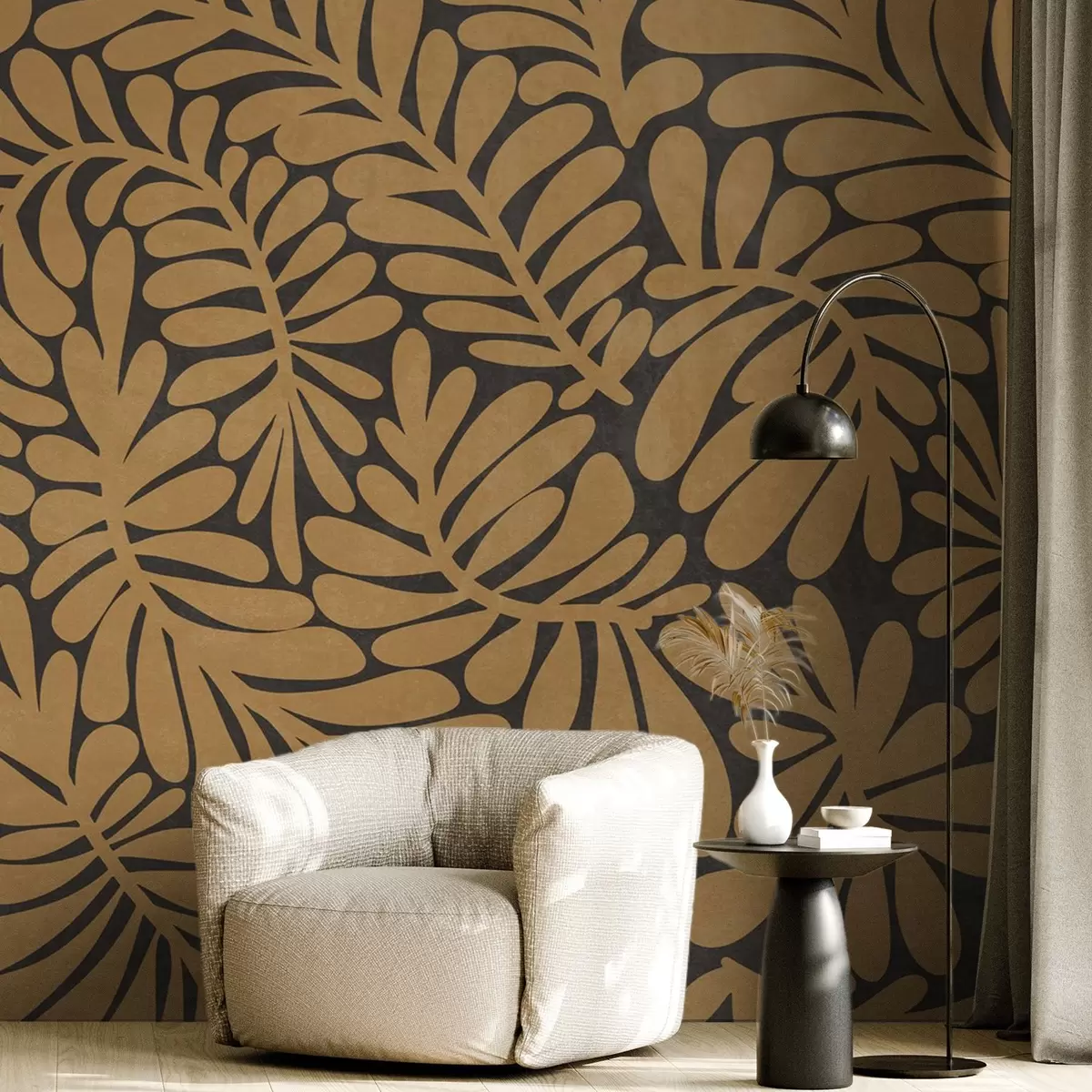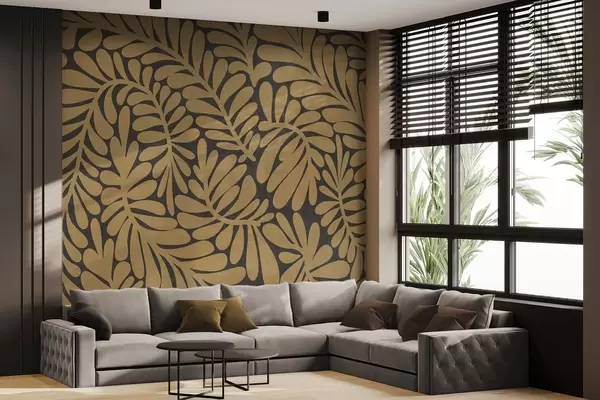 Фототапет Стилизирани листа в цвят горчица на тъмносив фон, картина с текстура Nr w09775