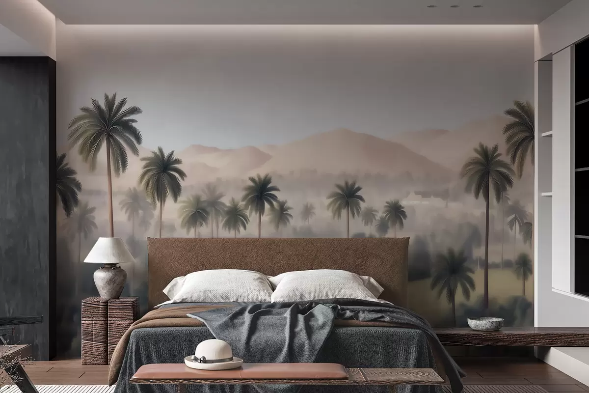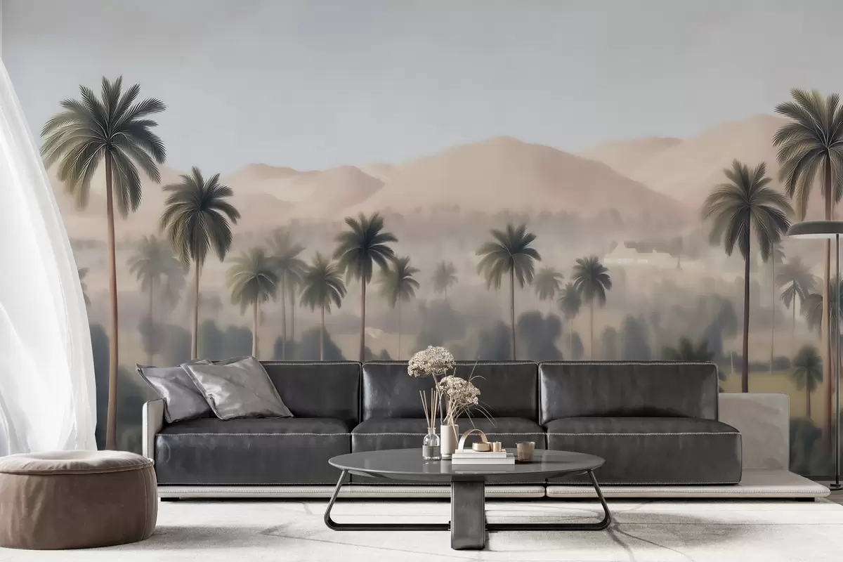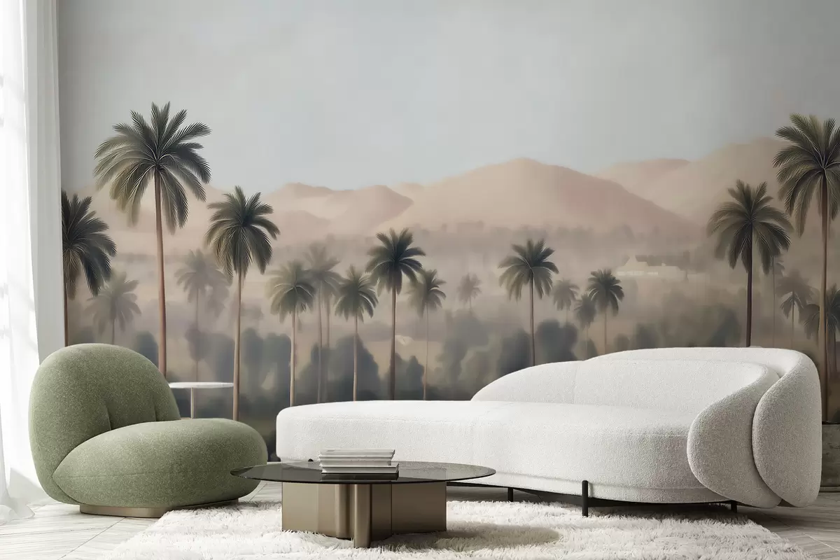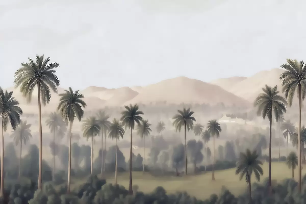 Фототапет Тропически пейзаж с палми и планини, ретро панорама в бежови и зелени нюанси Nr w09798