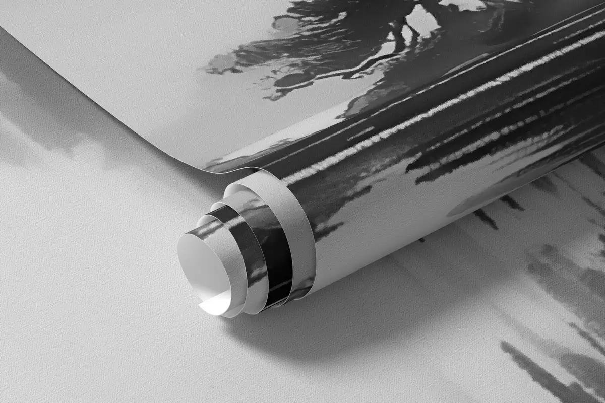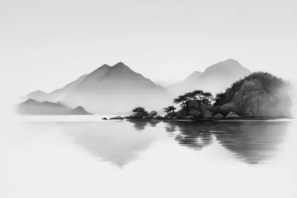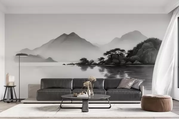 Фототапет Черно-бял пейзаж с планини и езеро, обгърнати от лека мъгла Nr w09803