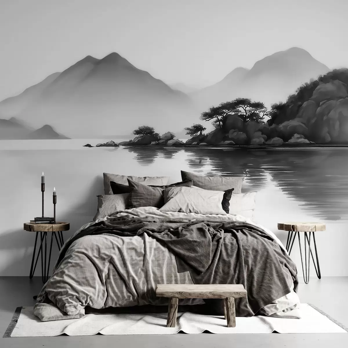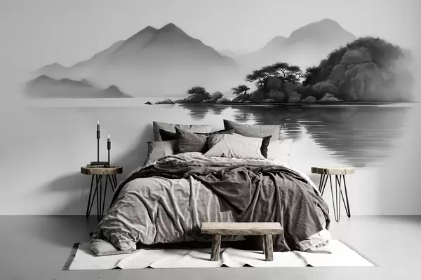 Фототапет Черно-бял пейзаж с планини и езеро, обгърнати от лека мъгла Nr w09803