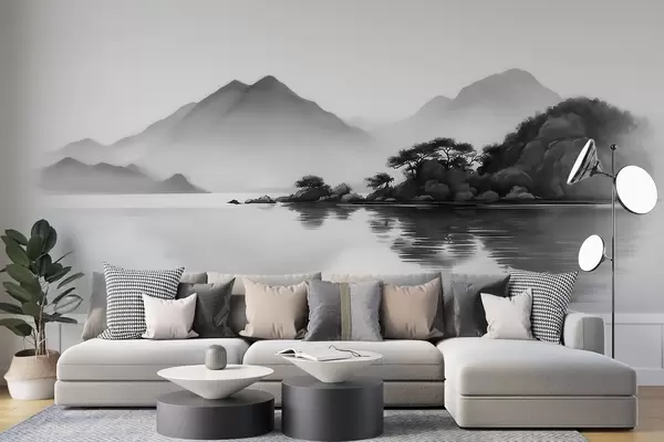 Фототапет Черно-бял пейзаж с планини и езеро, обгърнати от лека мъгла Nr w09803