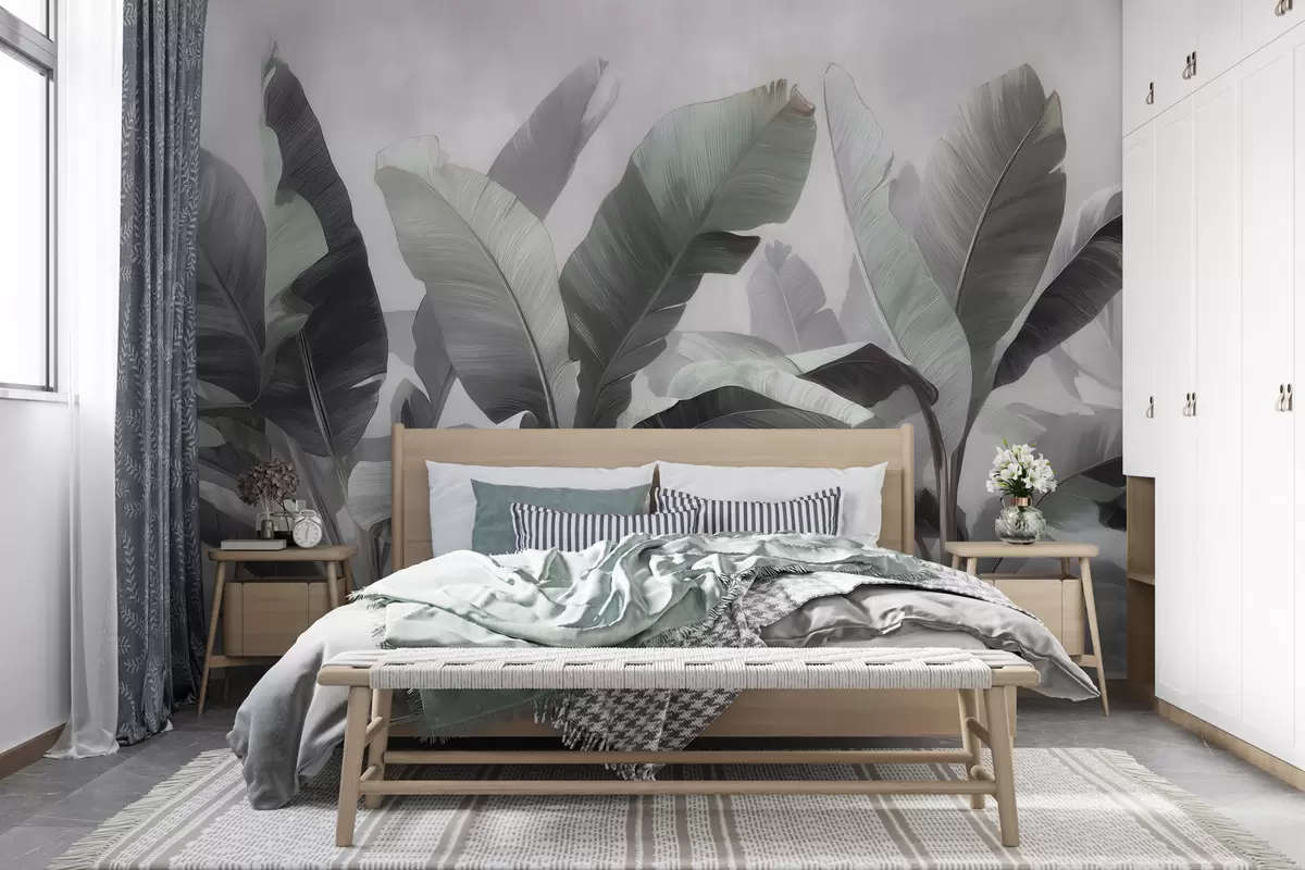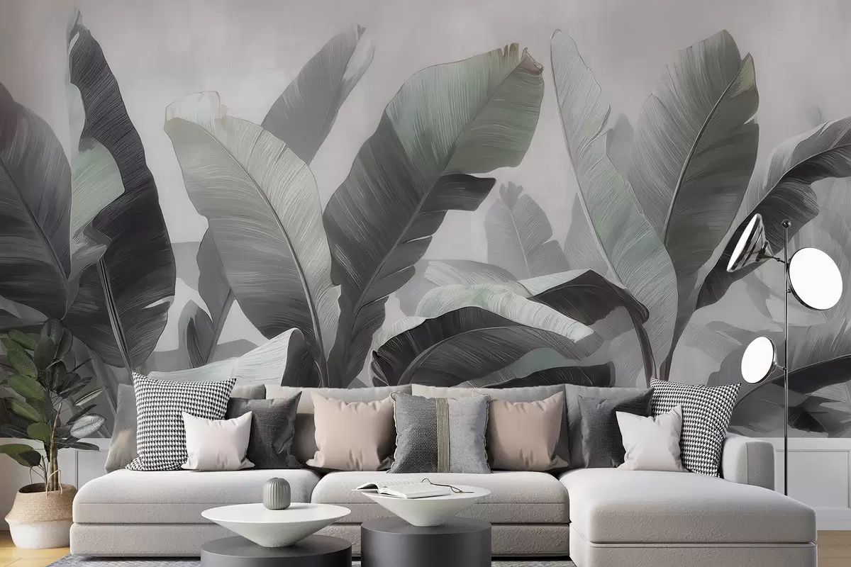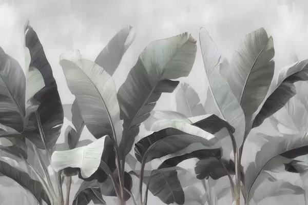 Фототапет Абстрактни изображения на големи тропически бананови листа в неутрална цветова гама с меки сиво-зелени нюанси Nr w09805