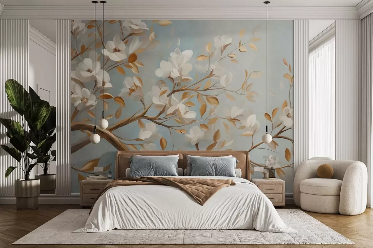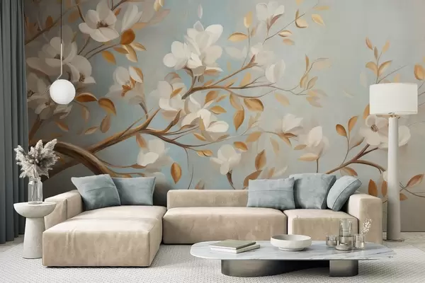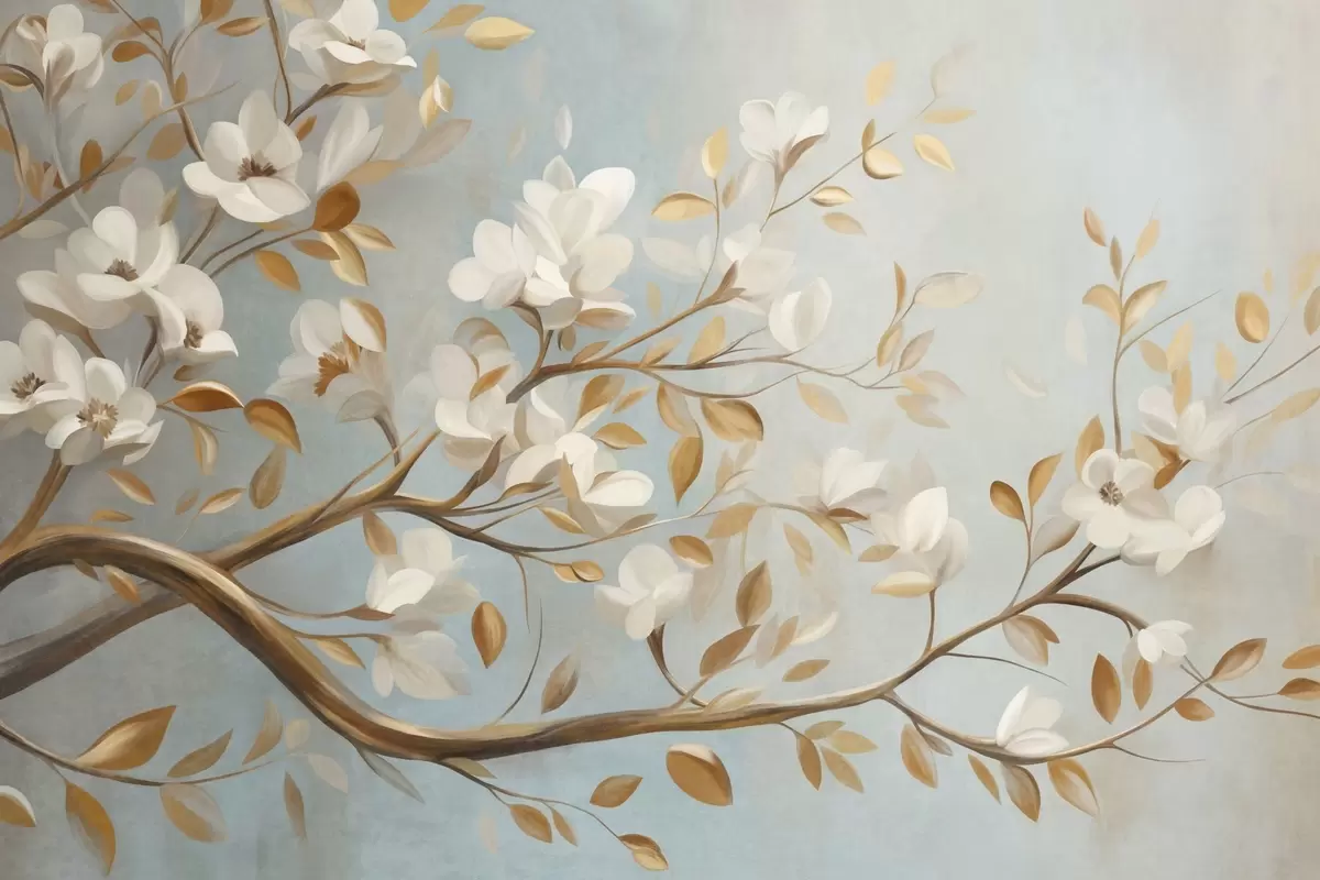 Фототапет Текстурирана клонка с бели цветя и жълти листа, в ретро стил Nr w09814