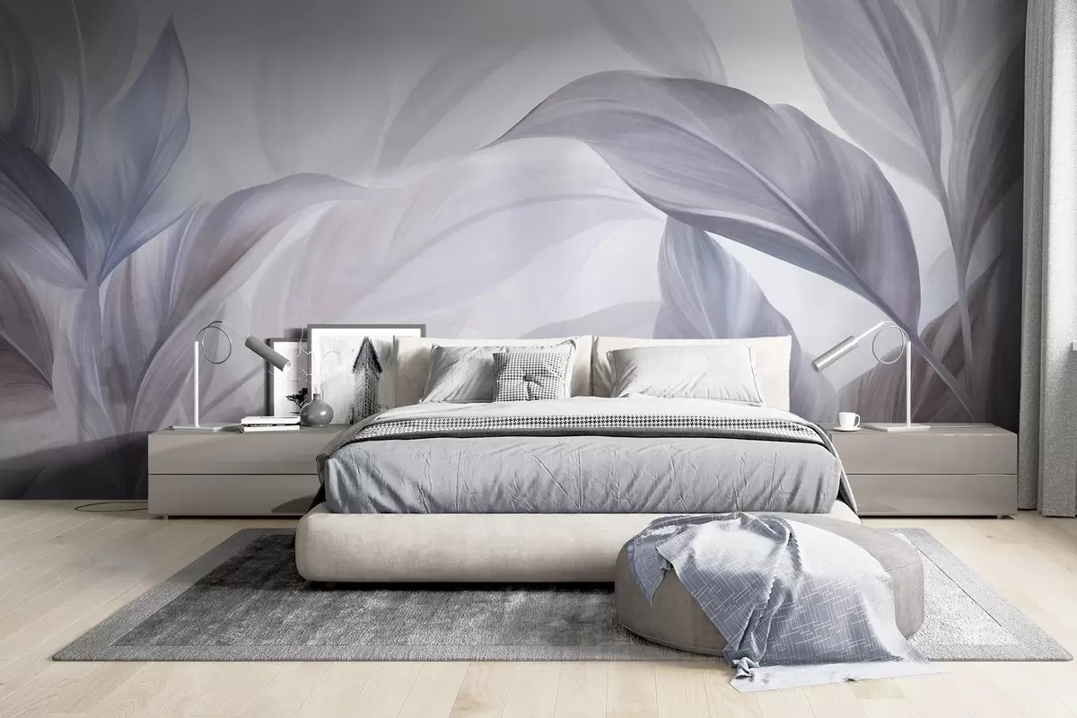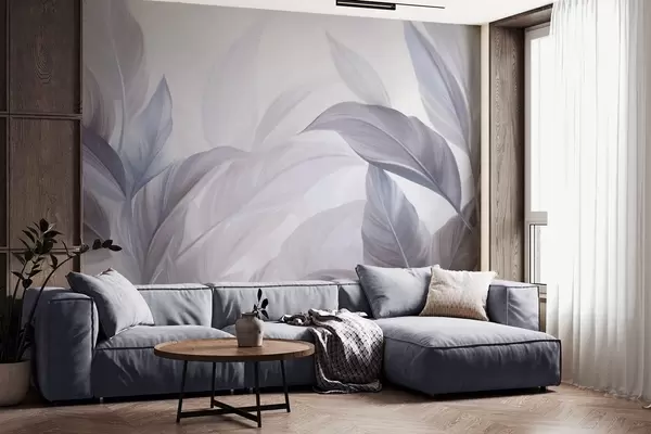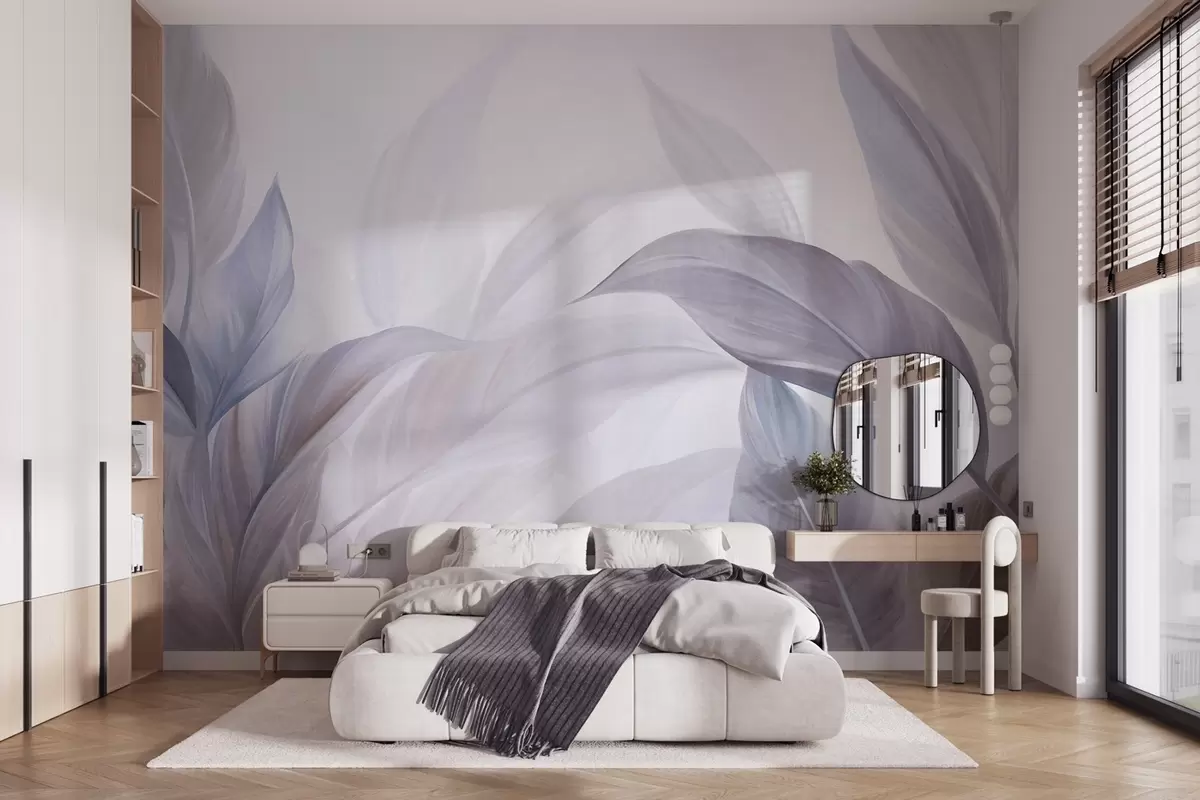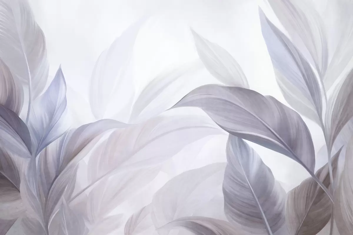 Фототапет Големи тропически листа в бледосини и лилави нюанси с нежни пастелни цветове и релефна текстура Nr w09816v1