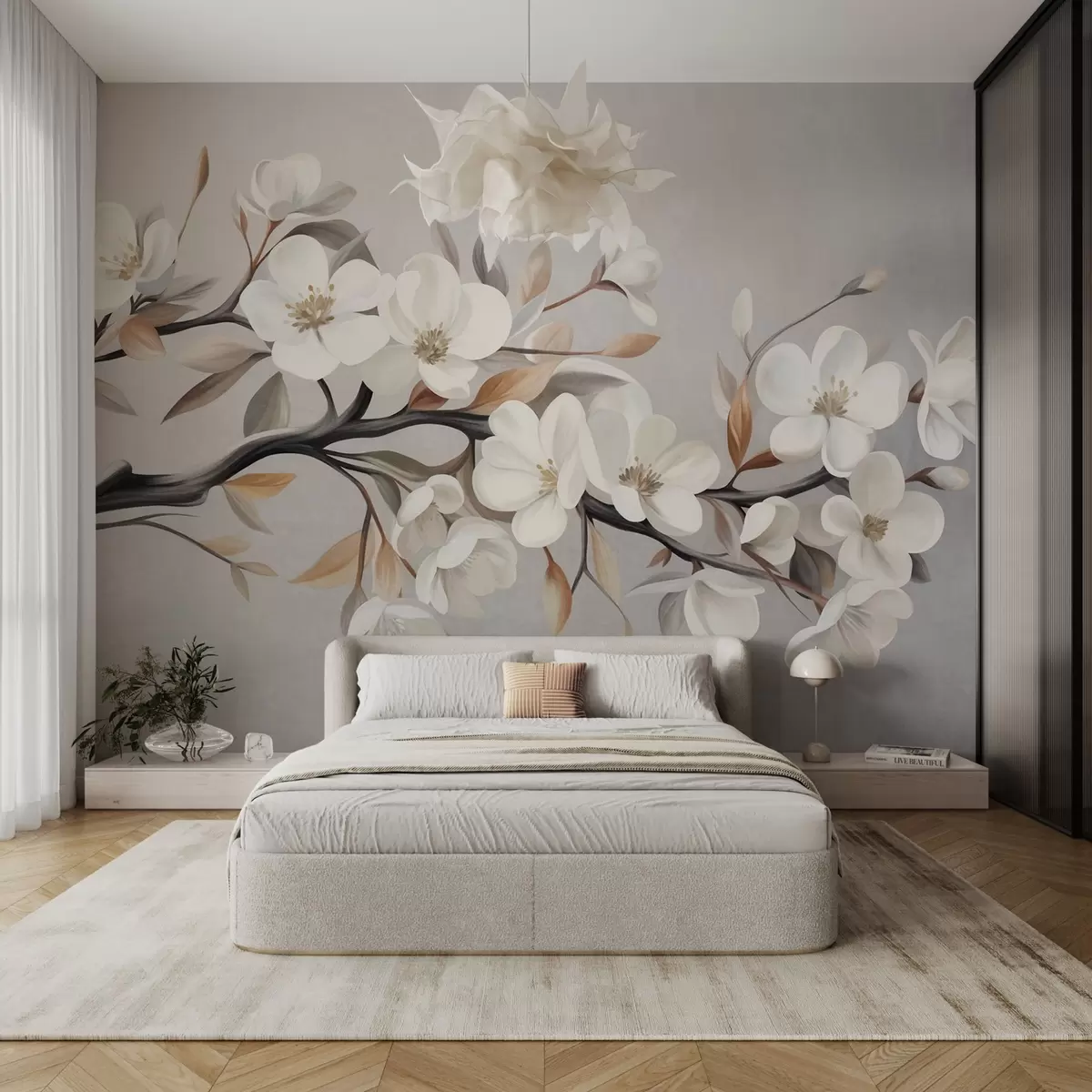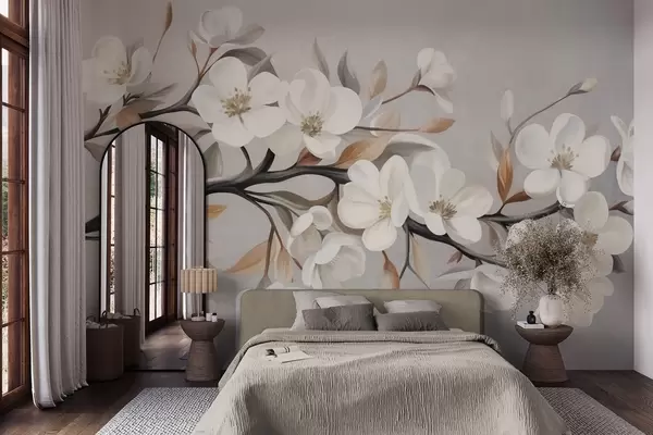 Фототапет Клон с релефна текстура, с бели цветя и кафяви листа на светлосив фон Nr w09817