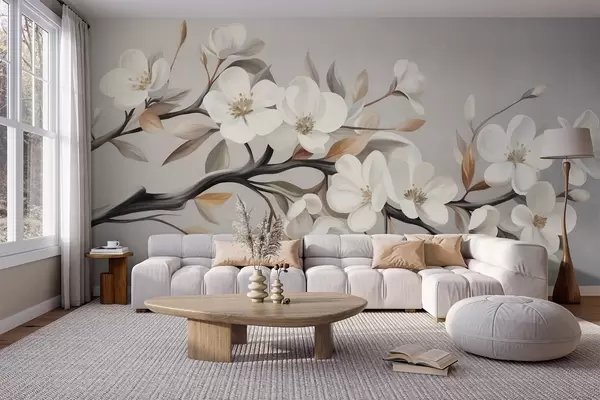 Фототапет Клон с релефна текстура, с бели цветя и кафяви листа на светлосив фон Nr w09817