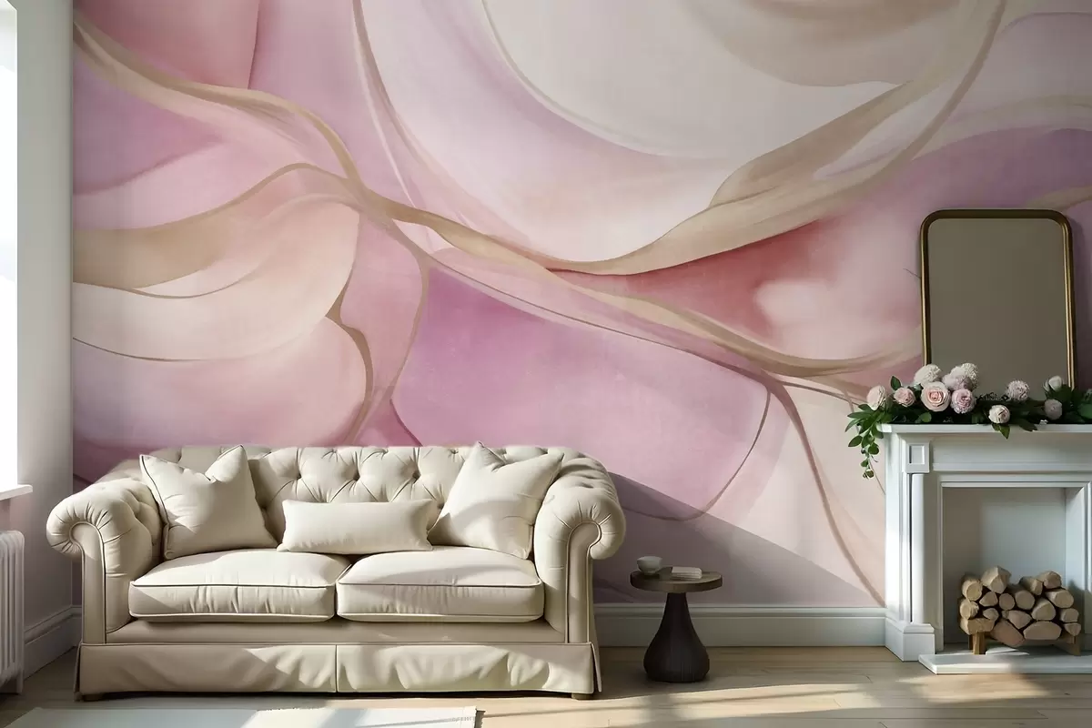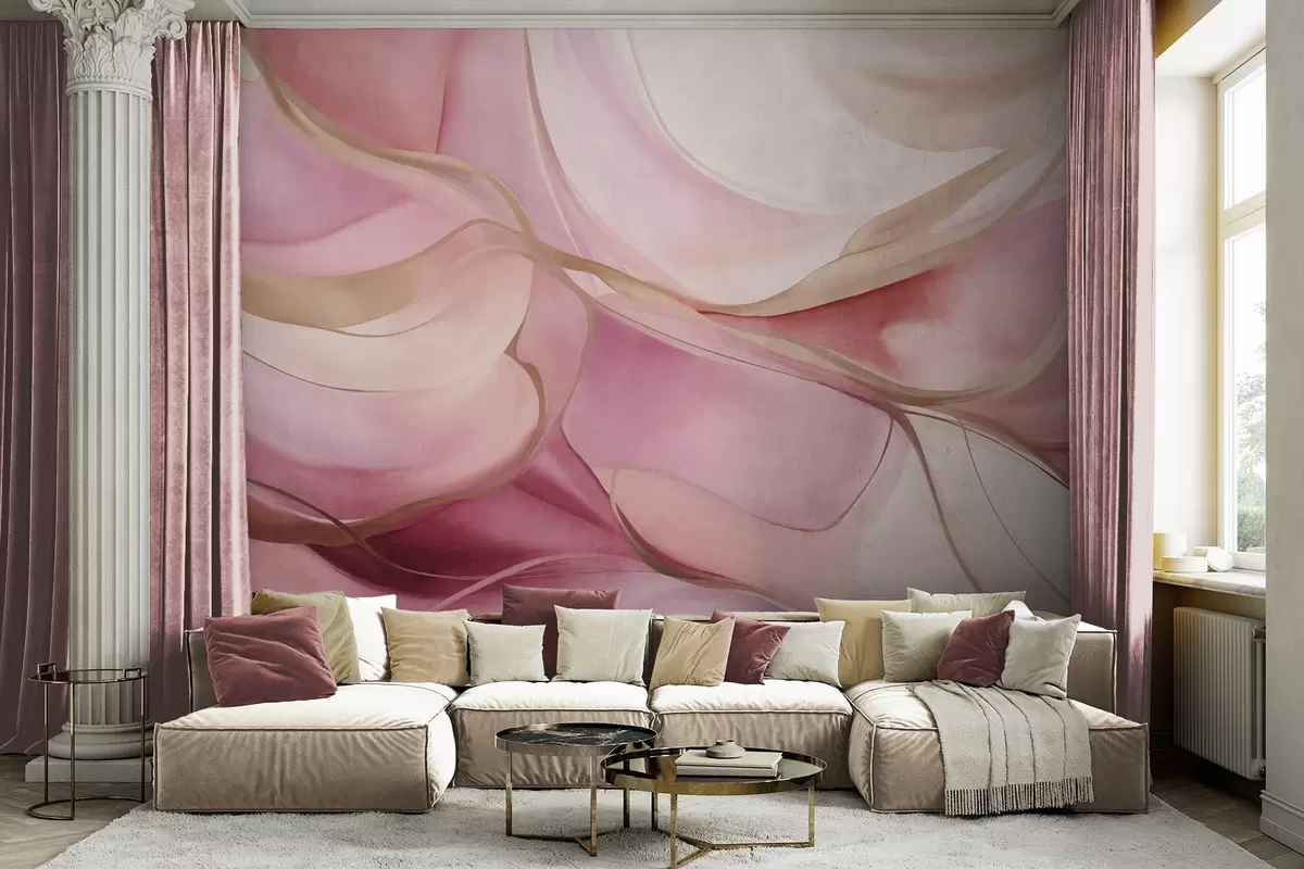 Фототапет Абстрактни, текстурирани, плавни форми в нюанси на розово и бежово с нежни жълти линии Nr w09818