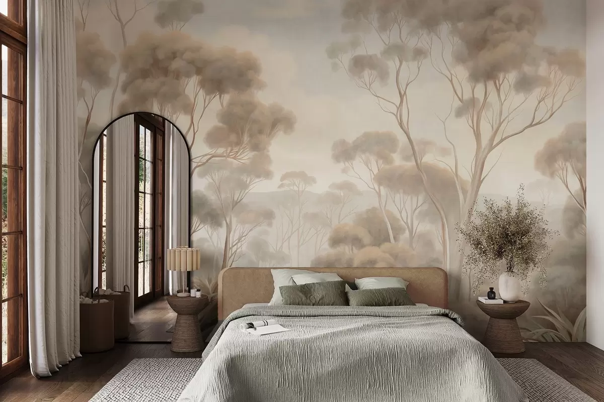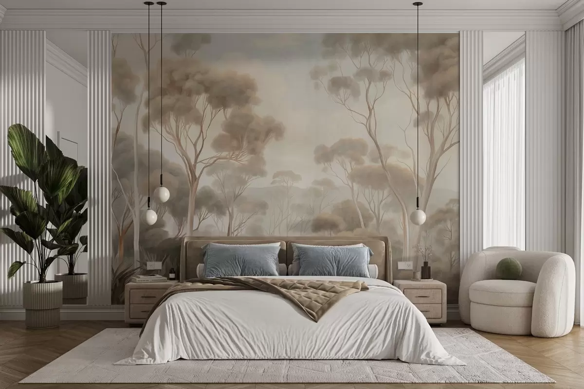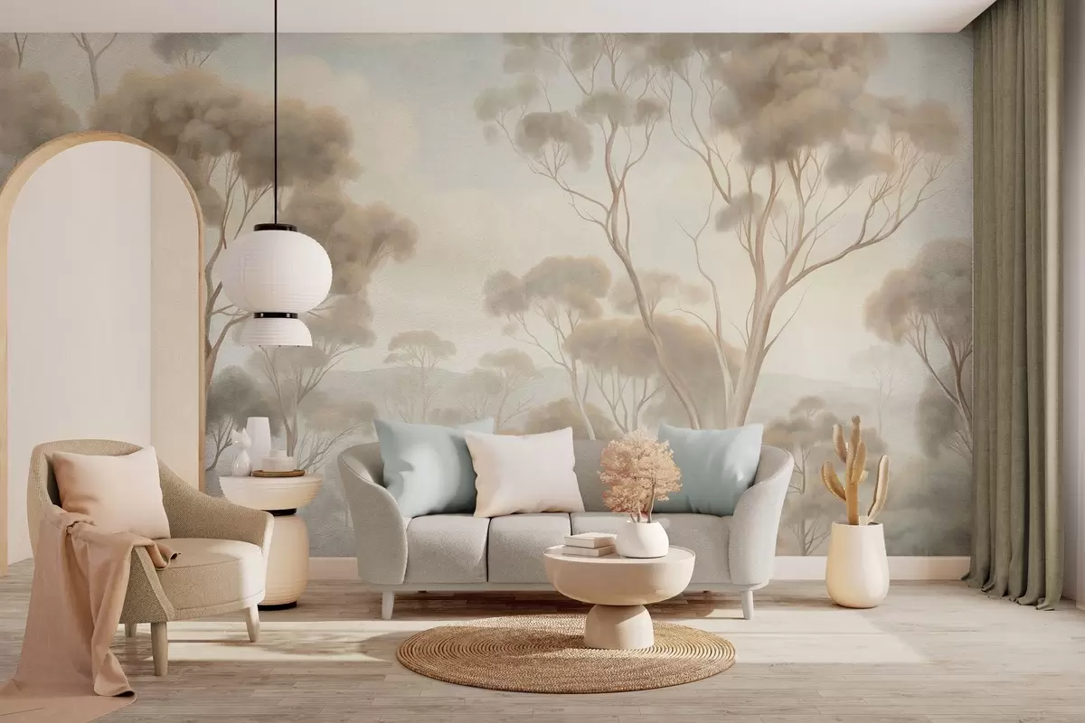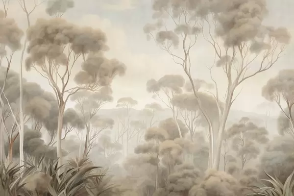 Фототапет Мъглив горски пейзаж с високи евкалиптови дървета, с хълмисти склонове под облачно небе, картина с богат релеф Nr w09822