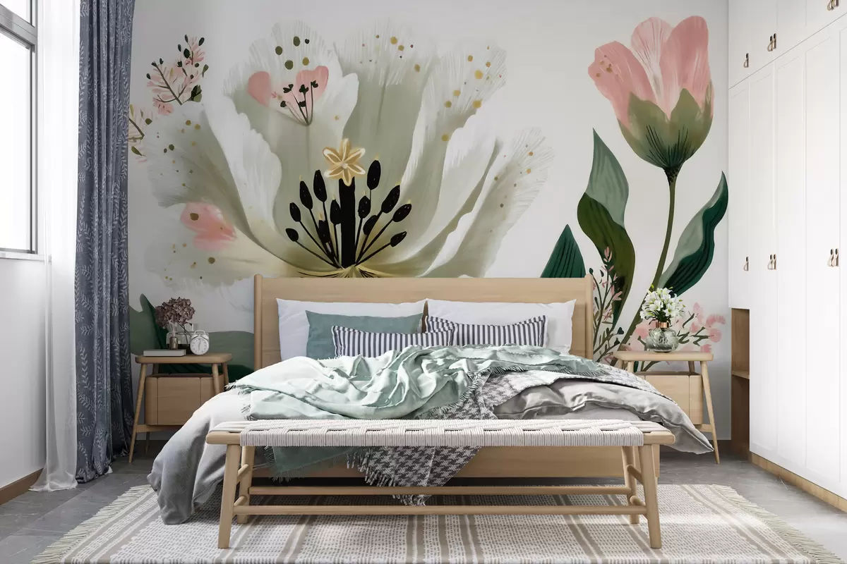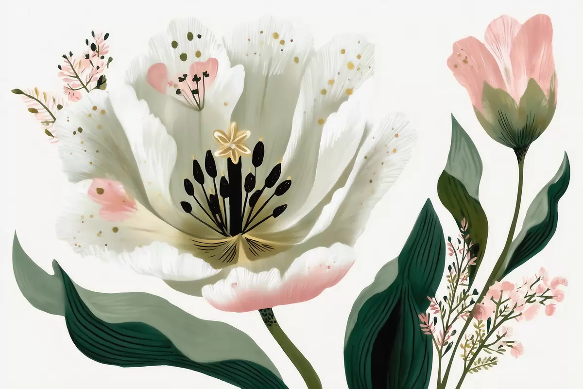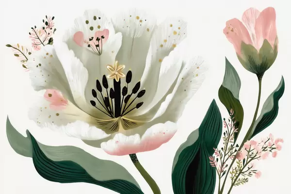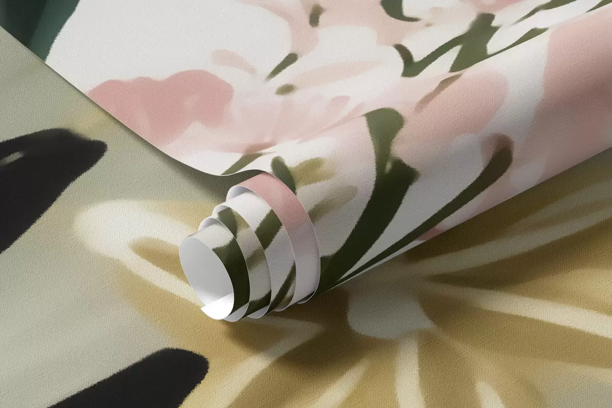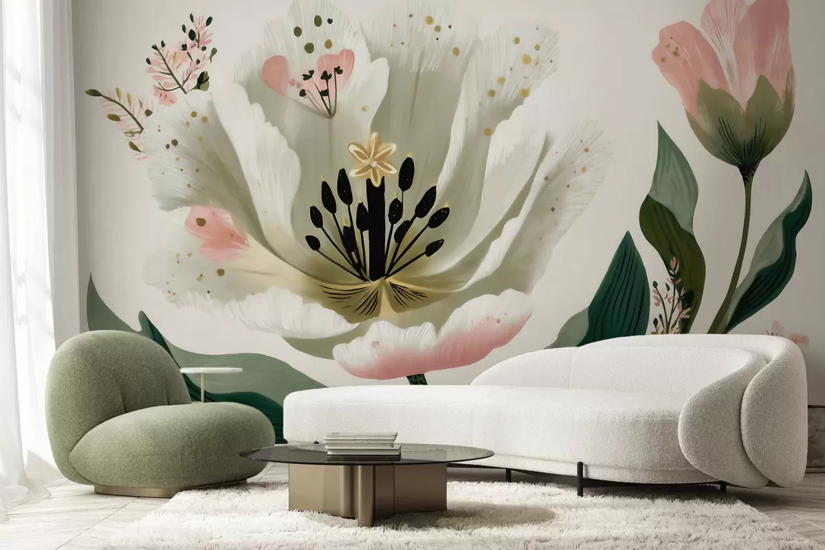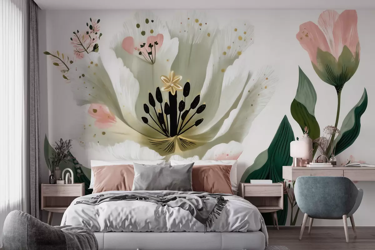 Фототапет Цвете със зелени листа и нежни розови акценти в акварелен стил Nr w09836
