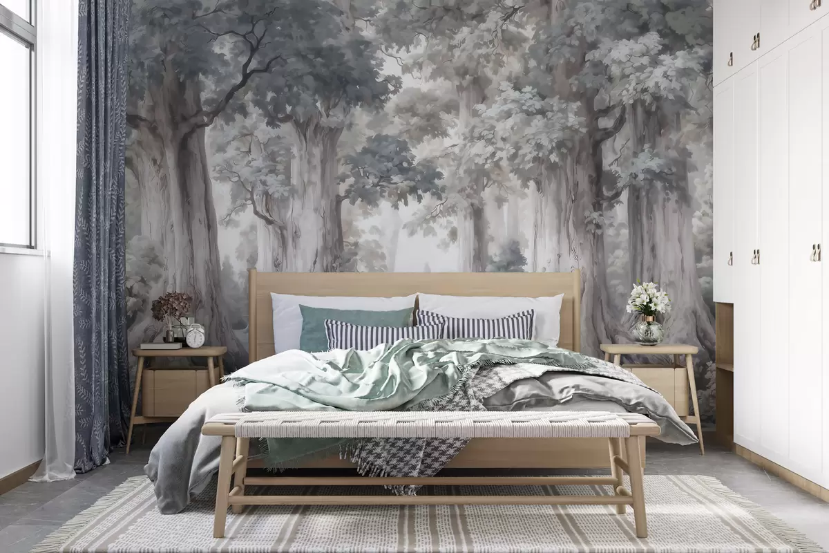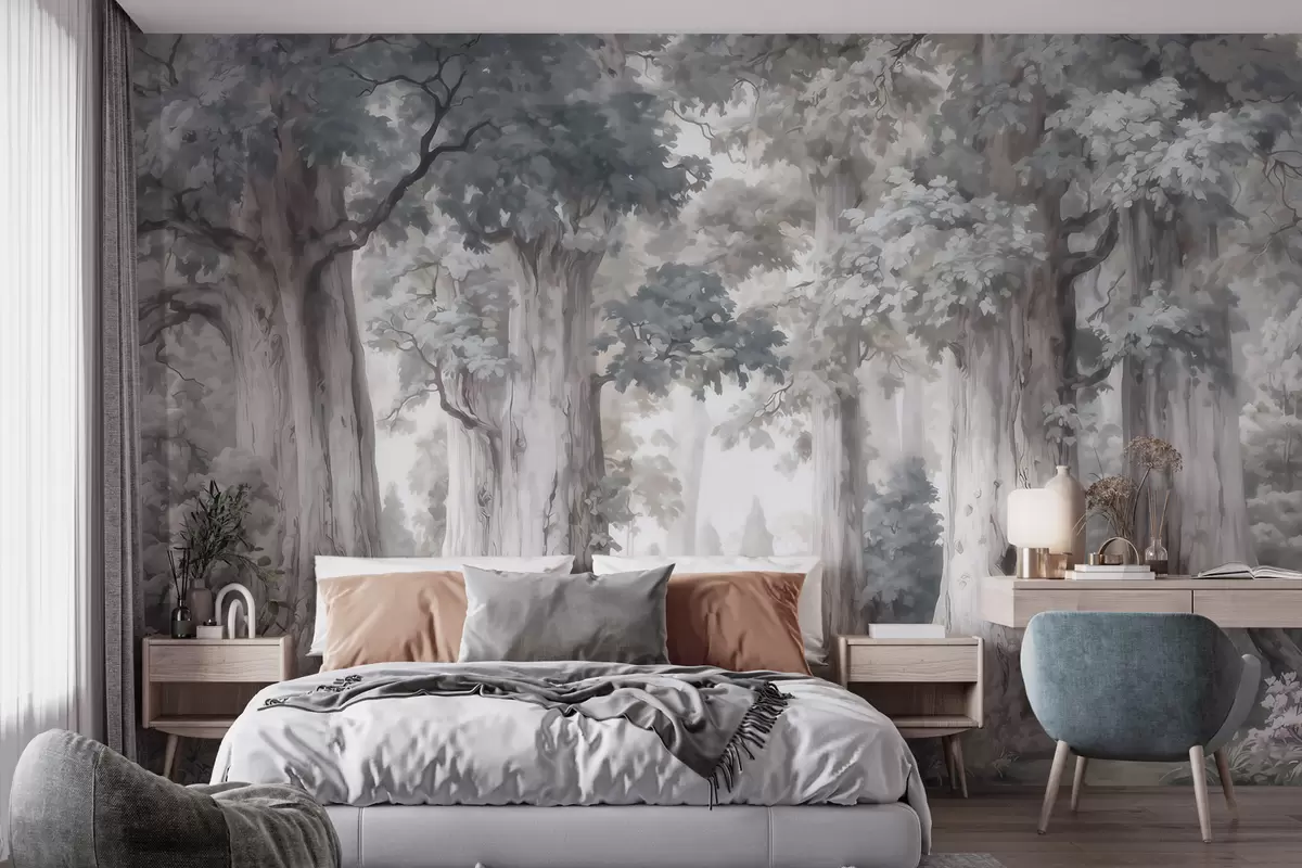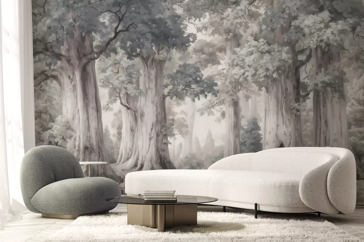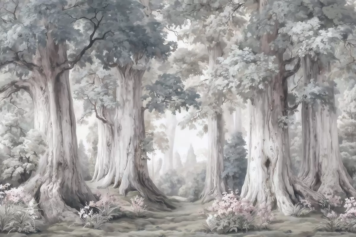 Фототапет Приказна гора с високи дървета и нежна, приглушена цветова гама в акварелен стил Nr w09849