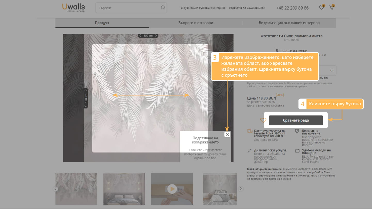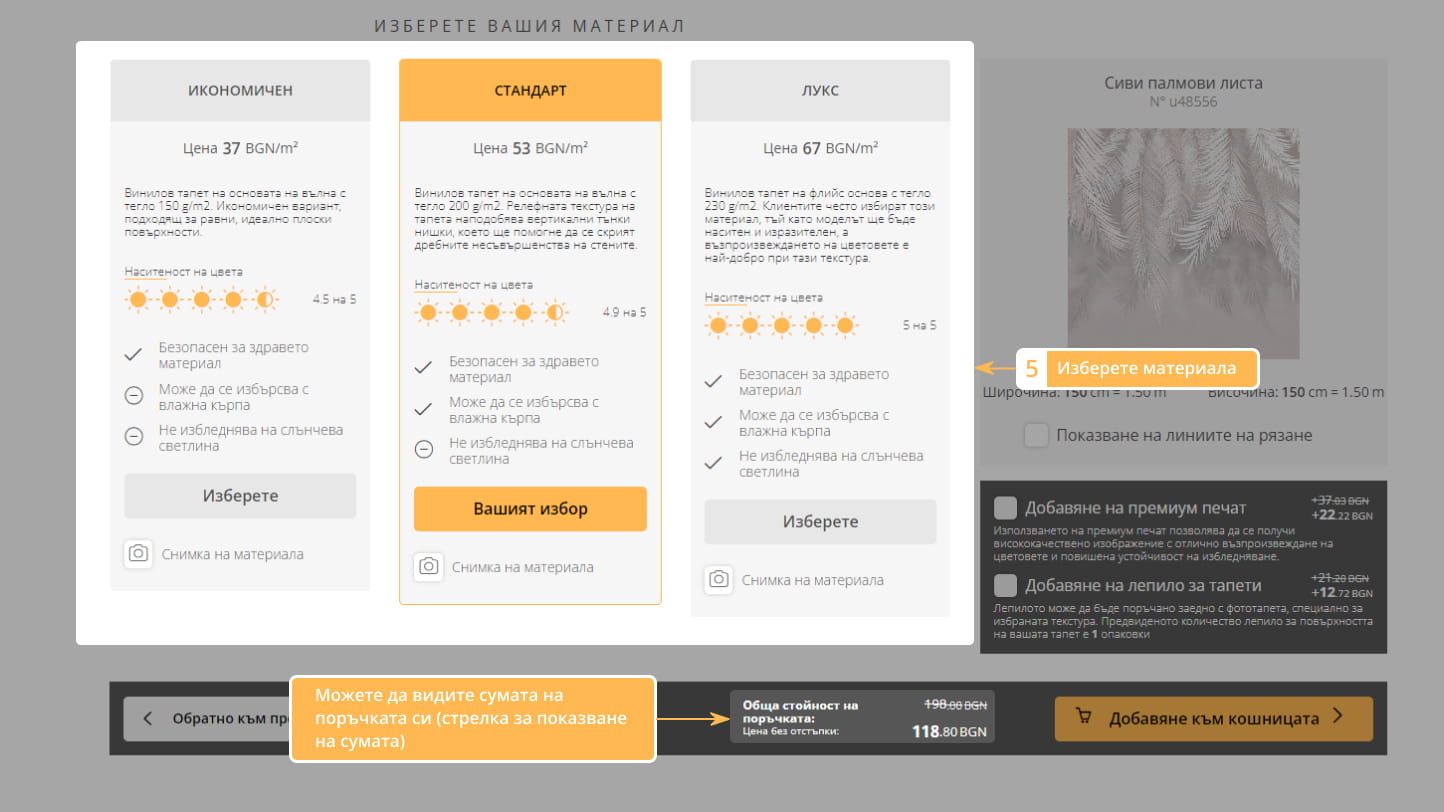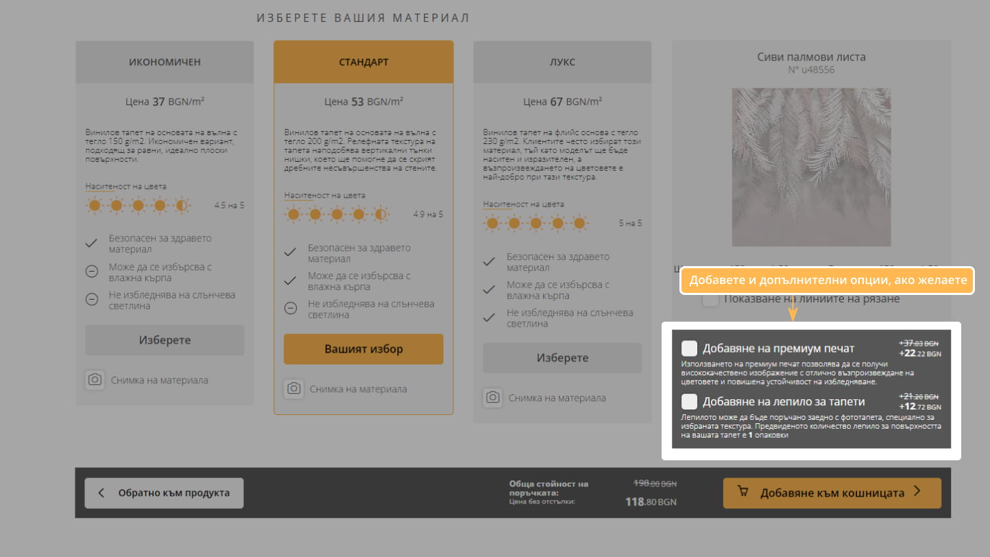 5. Изберете материала, добавете и допълнителни опции, ако желаете.