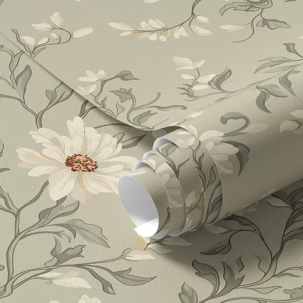 Тапет Бели цветя с извиващи се листа на светъл фон Nr. a00001v1