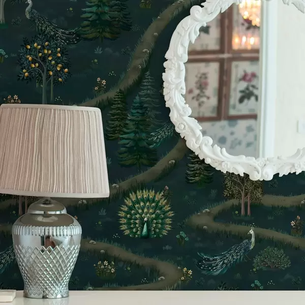 Тапет Криволичеща пътека с пауни и лимонови дръвчета на тъмен фон Nr. a00041v1