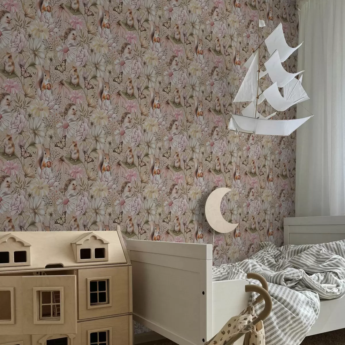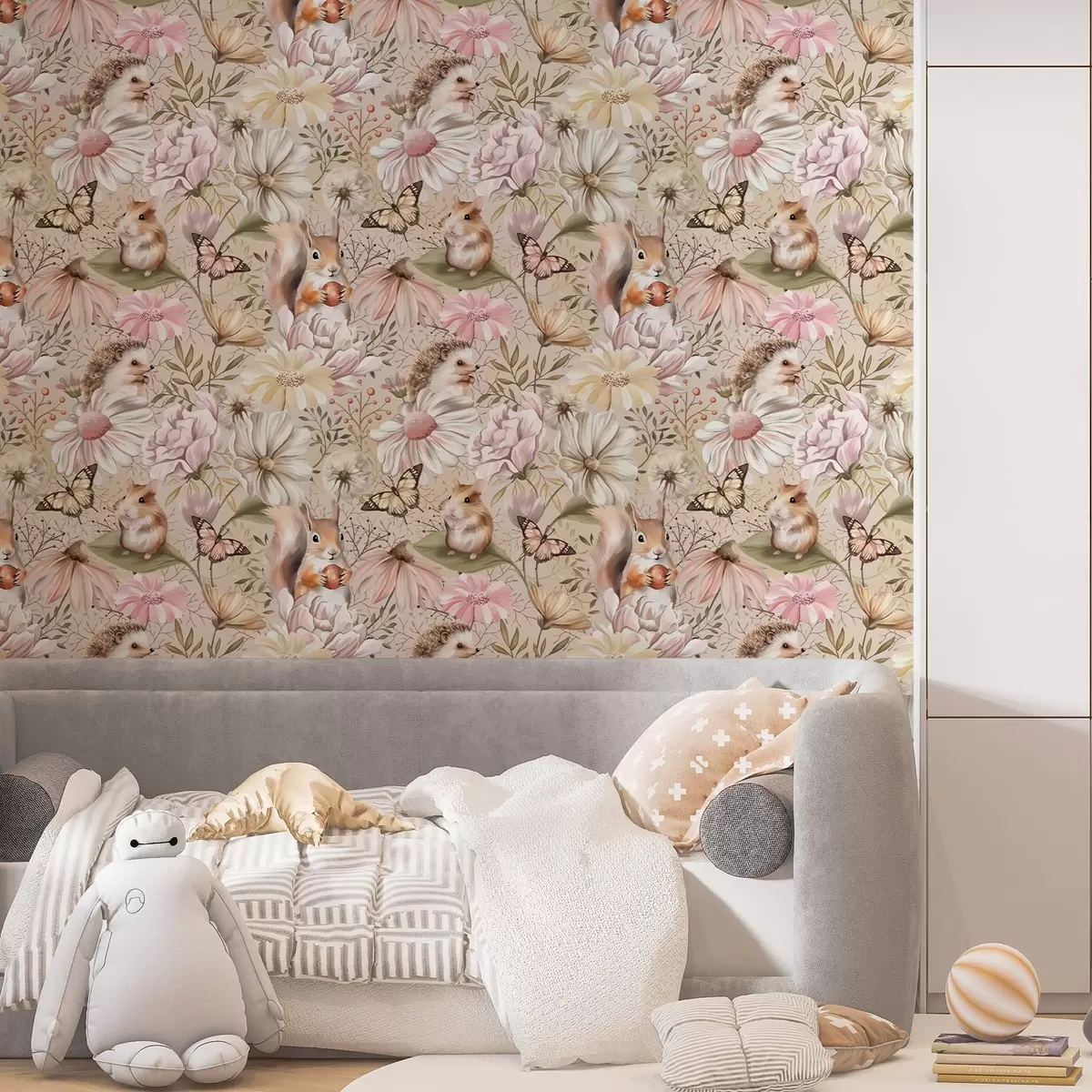 Тапет Симпатичен таралеж, катерица, хамстер и пеперуди с цветя в пастелни цветове Nr. a00051