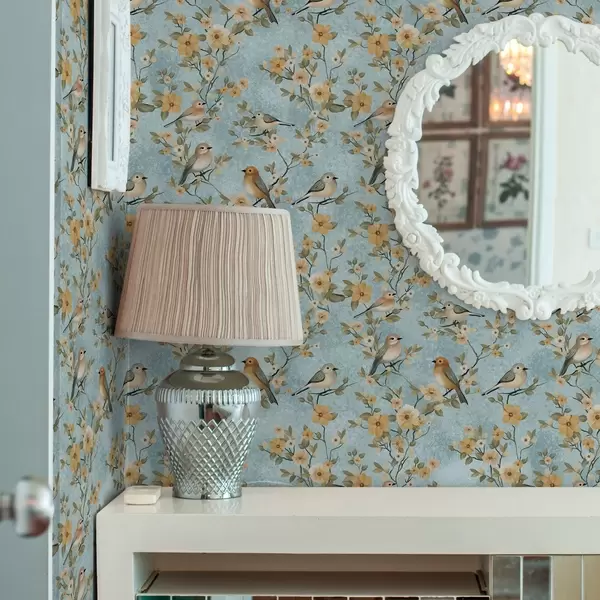 Тапет Малки птици върху клони на син фон Nr. a00092