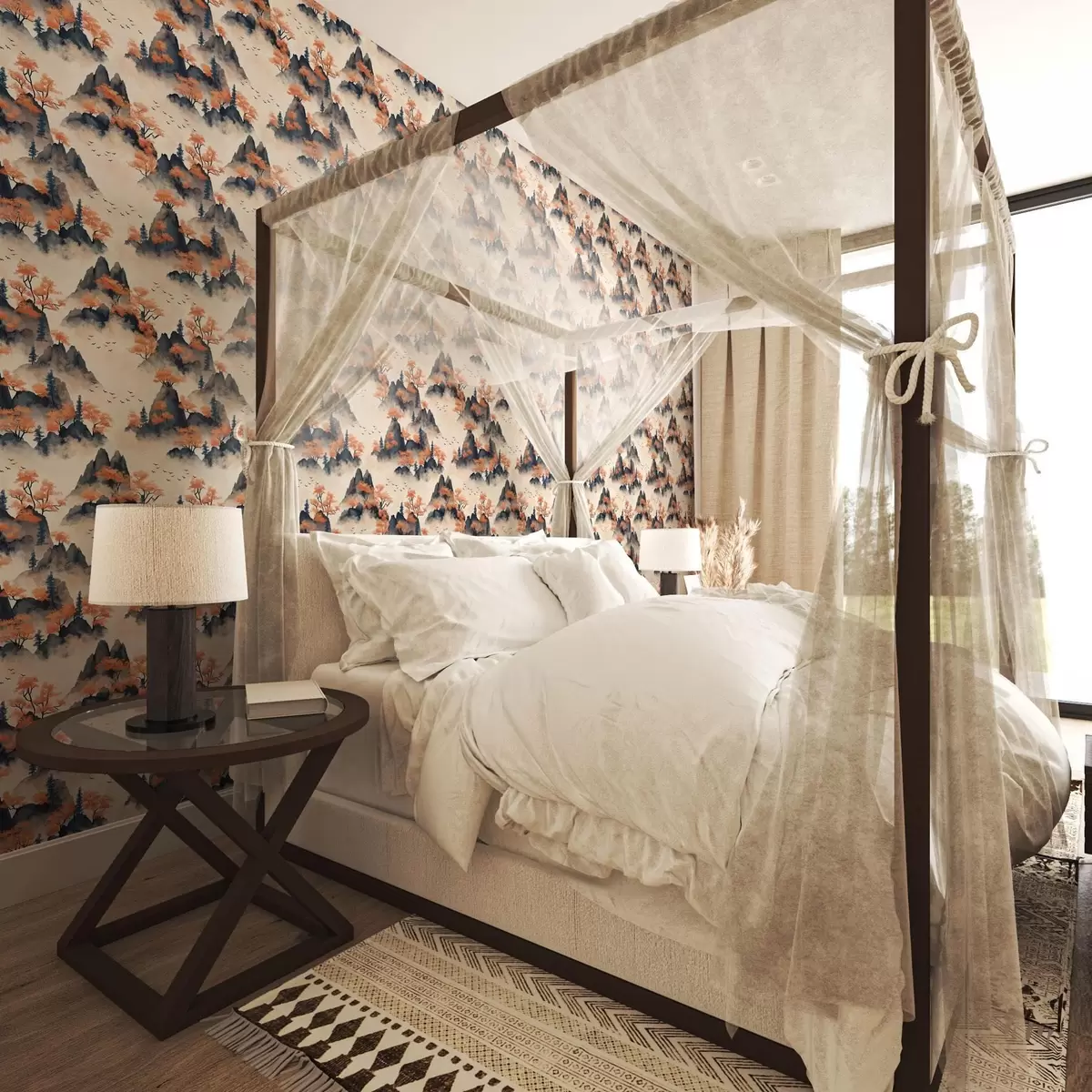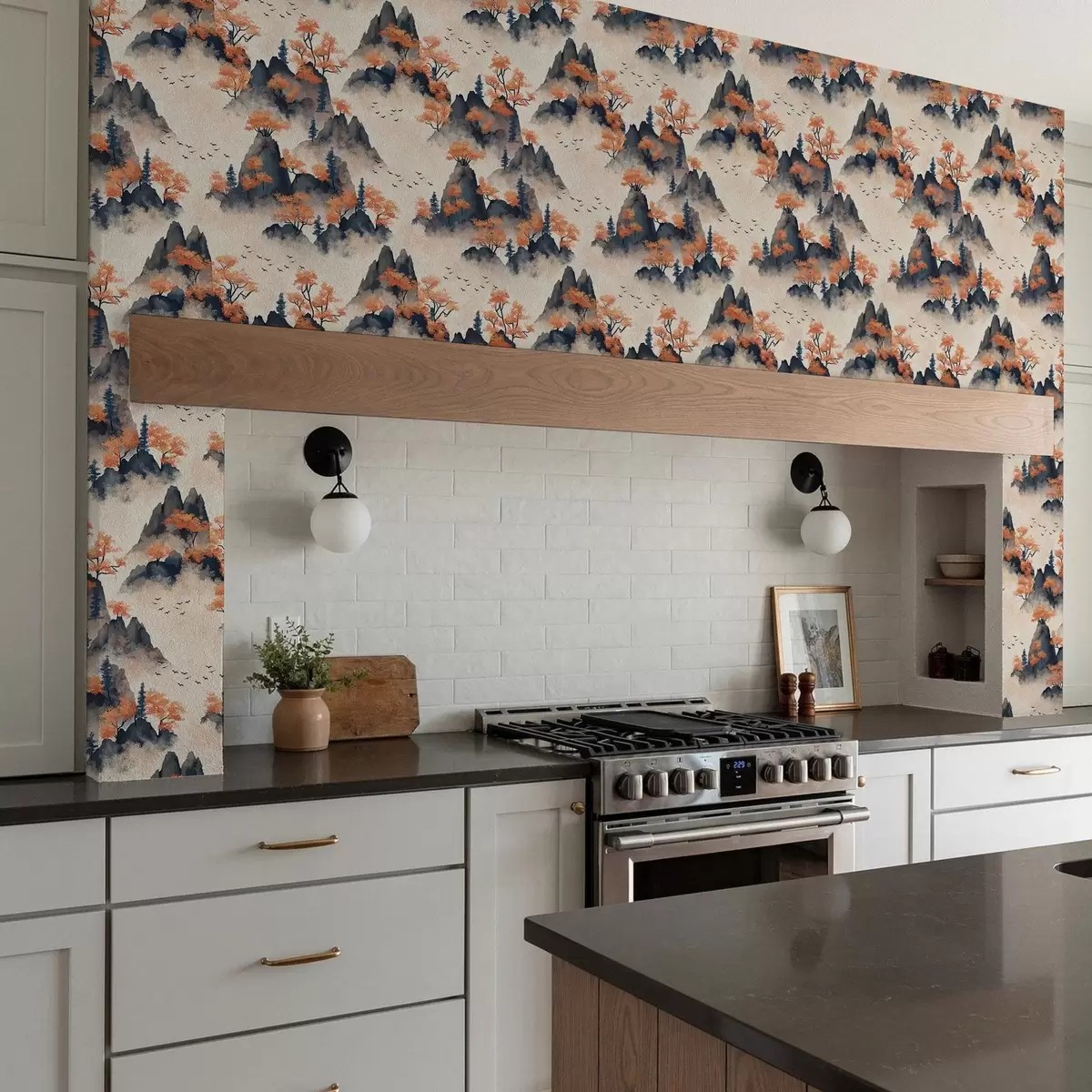 Тапет Есенни планини в мъгла с оранжеви дървета и птици Nr. a00104