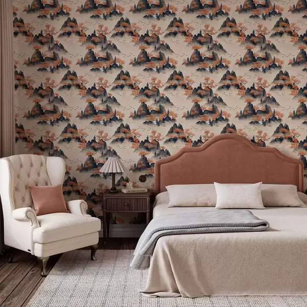 Тапет Есенни планини в мъгла с оранжеви дървета и птици Nr. a00104