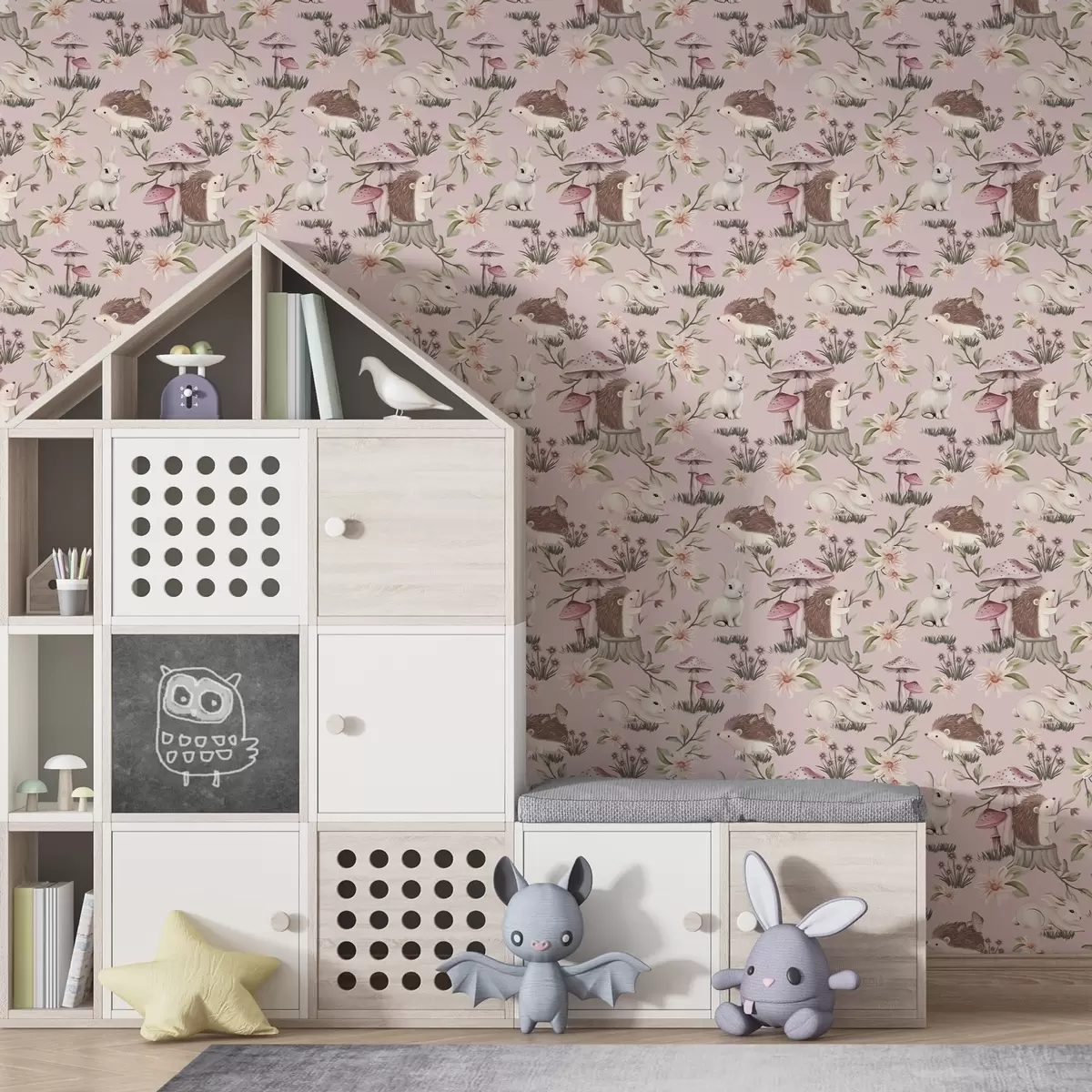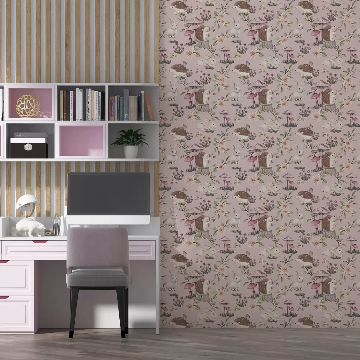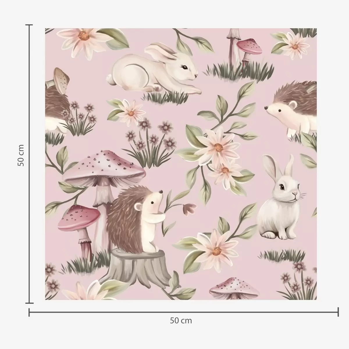 Тапет Таралежи, зайци и цветя сред гъби на розов фон в приказен стил Nr. a00111