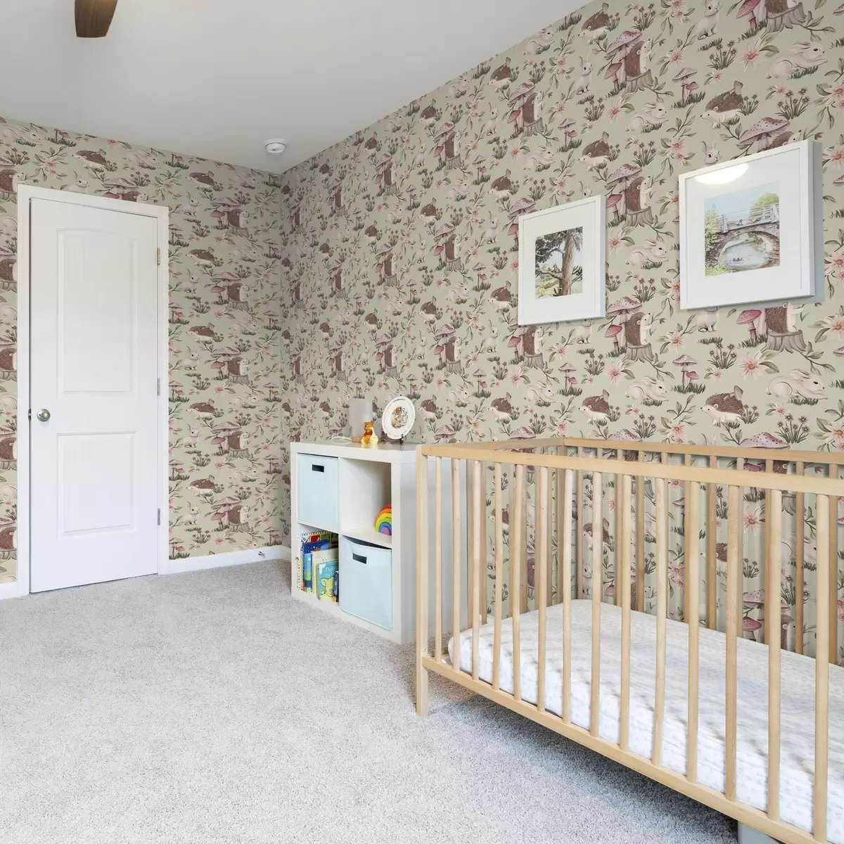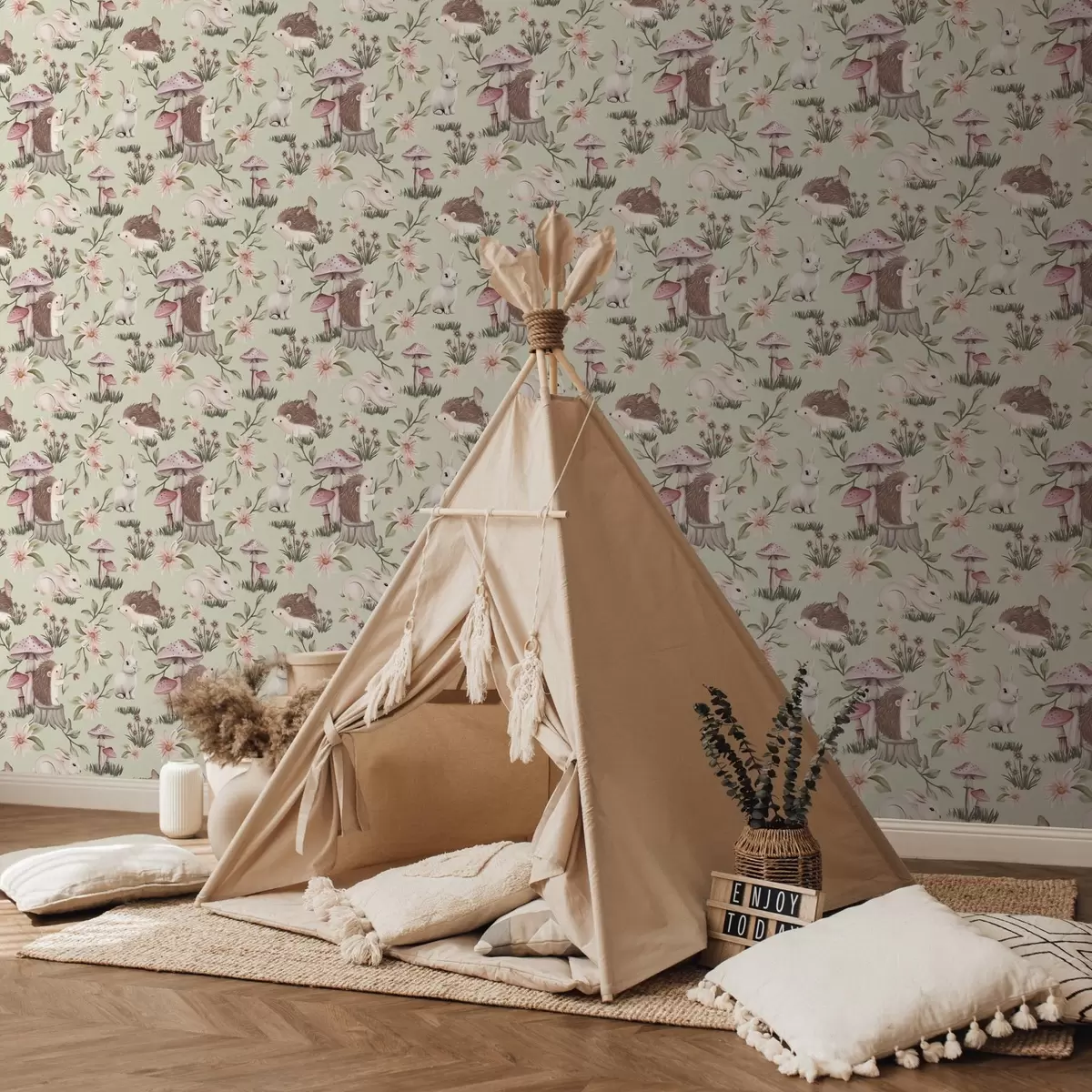 Тапет Приказни животни и цветя на зелен фон в нежни пастелни цветове Nr. a00111v1