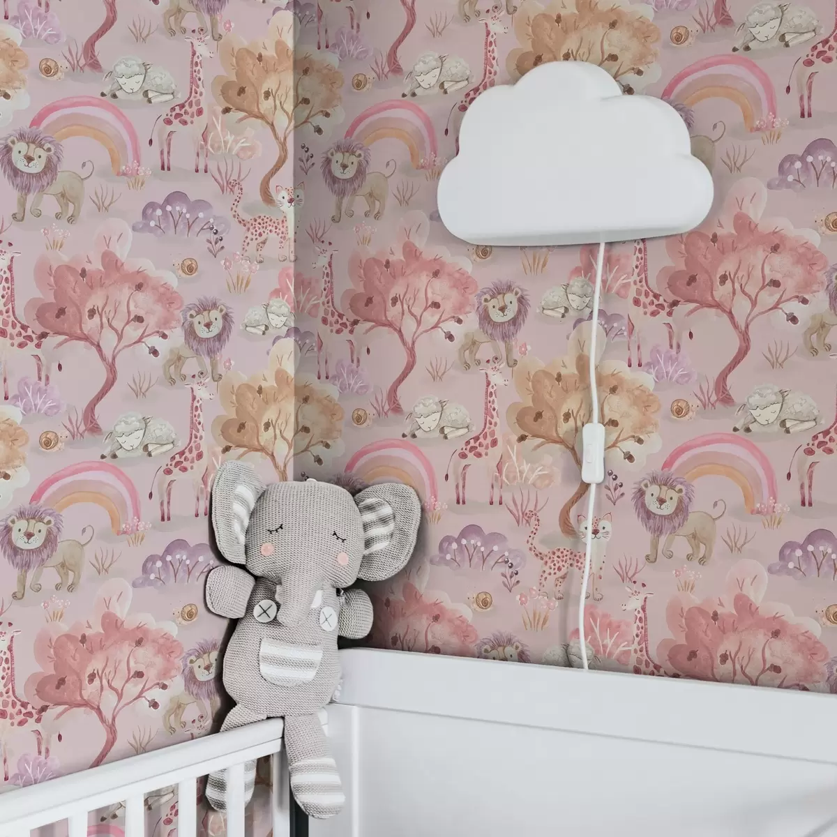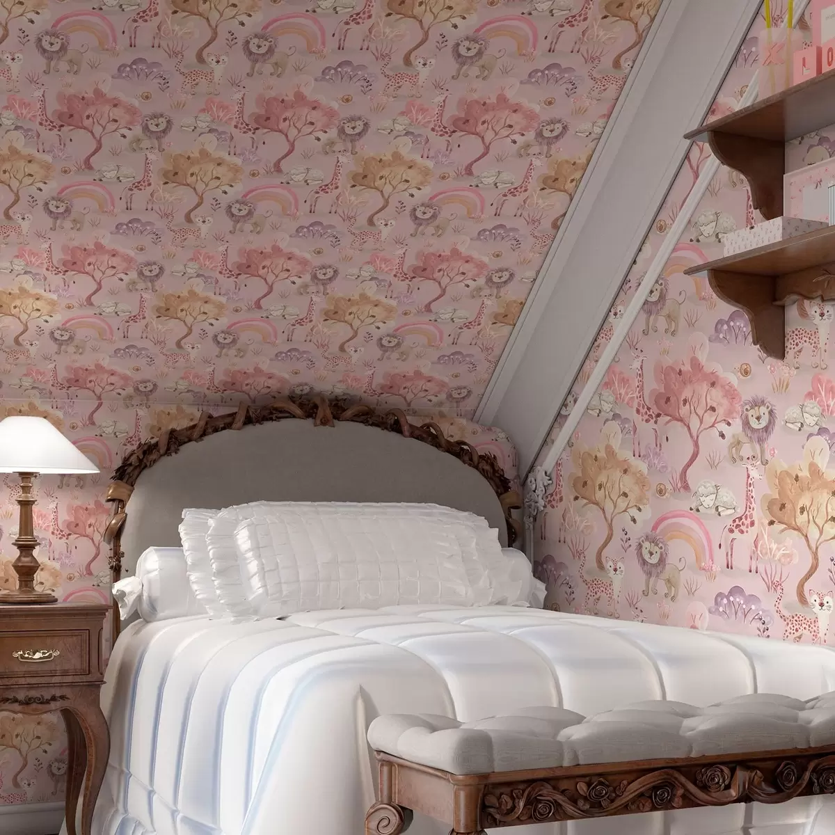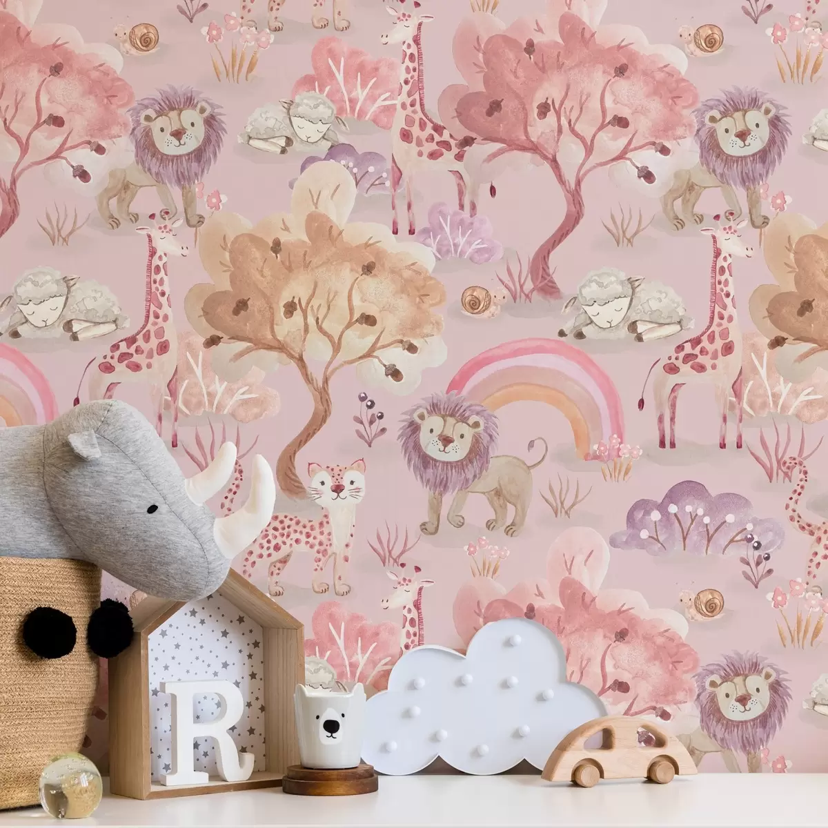Тапет Лъвчета, жирафи и дъги в пастелна гора Nr. a00112