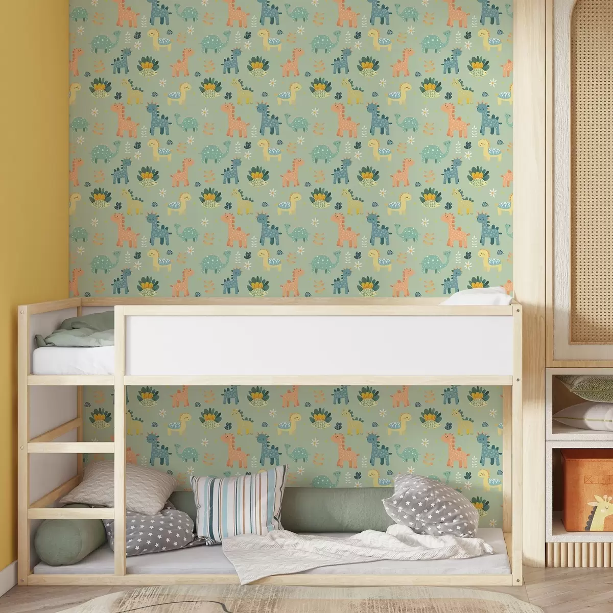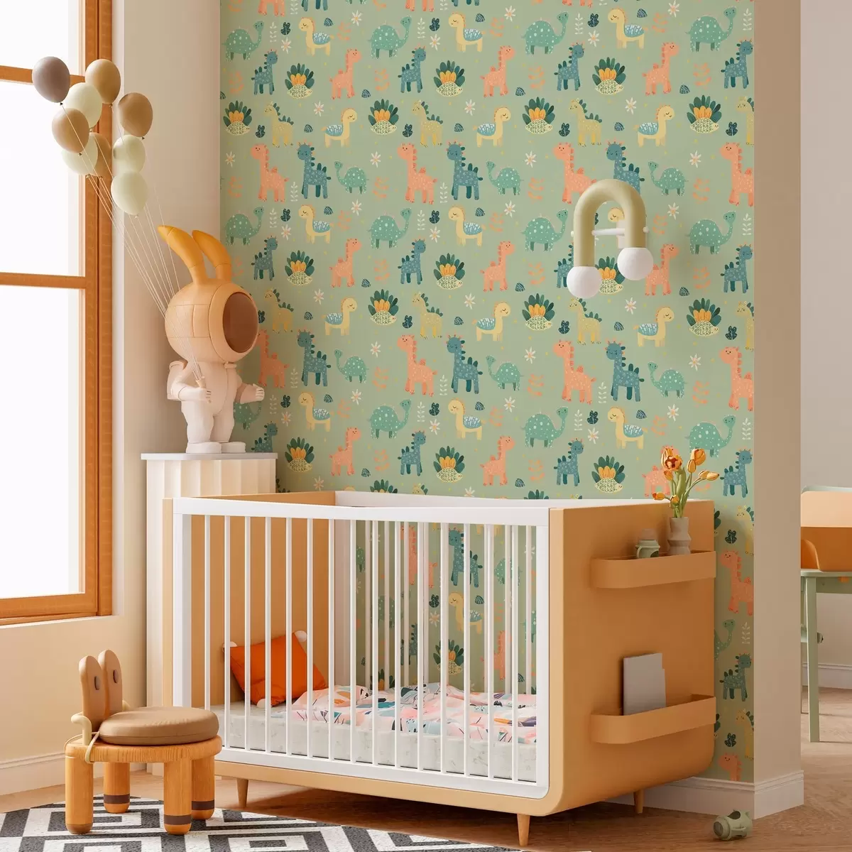 Тапет Забавни динозаври в мека зелена палитра на светъл фон Nr. a00125v1