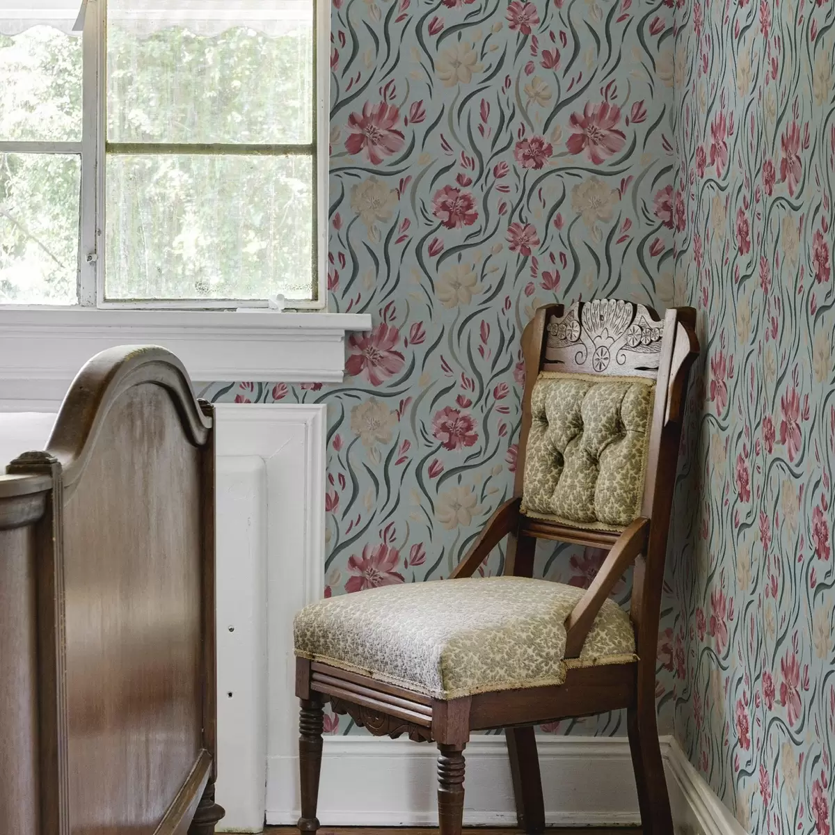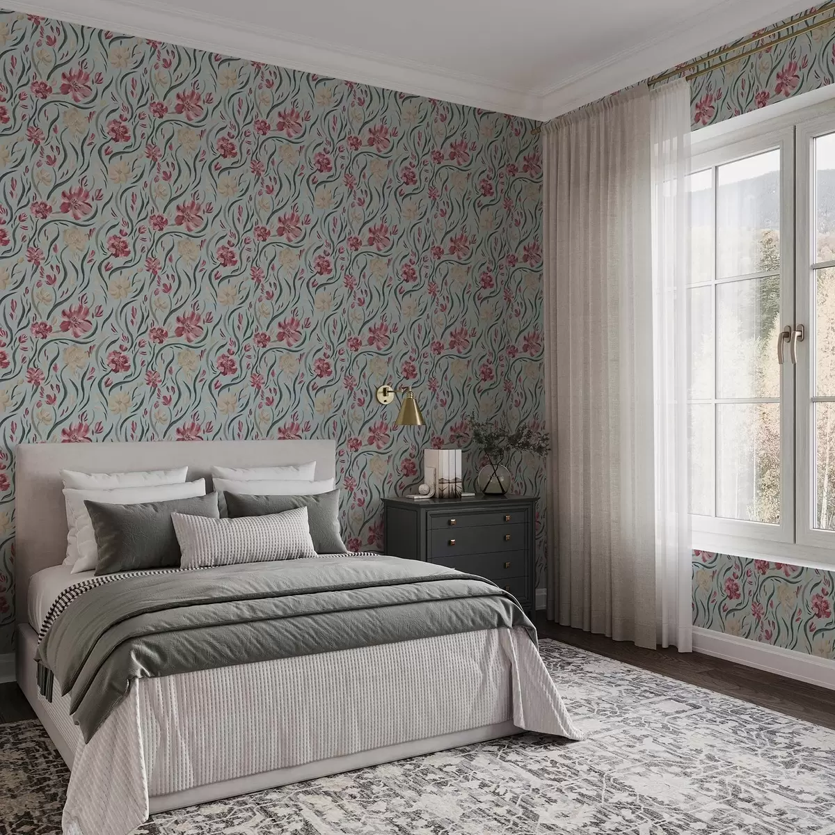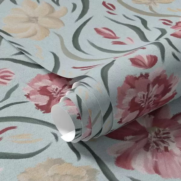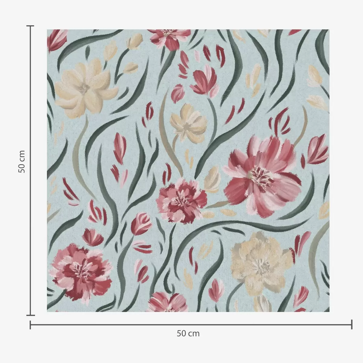 Тапет Акварелни цветя на син фон, червен и бежов модел Nr. a00216