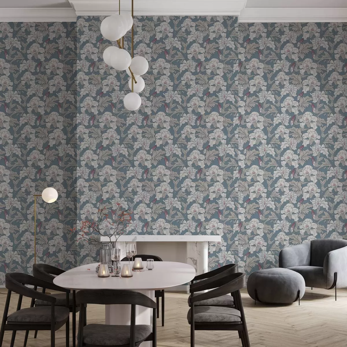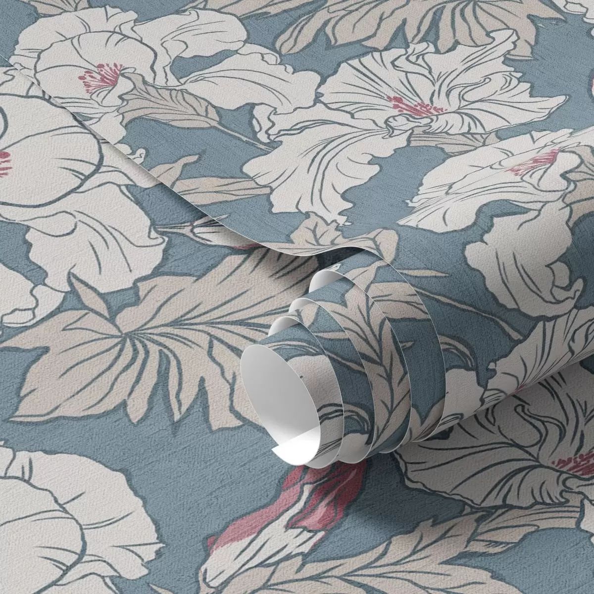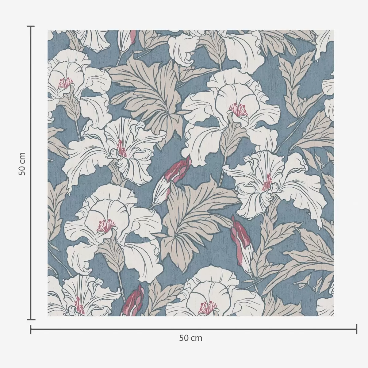 Тапет Бял хибискус на син фон с контурна шарка Nr. a00272v1