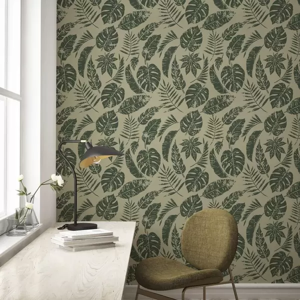 Тапет Тропически листа в стил линогравюра, зелено върху жълто Nr. a00274