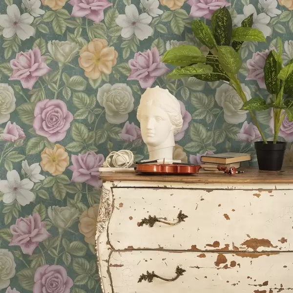 Тапет Розово-кремави и жълти рози на зелен фон Nr. a00300