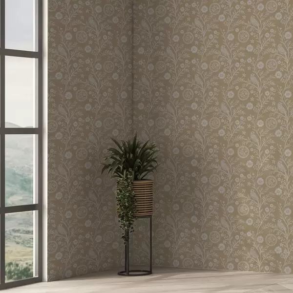 Тапет Деликатна скица на бяла птица и цвете бяла птица и цвете на фон от охра Nr. a00393