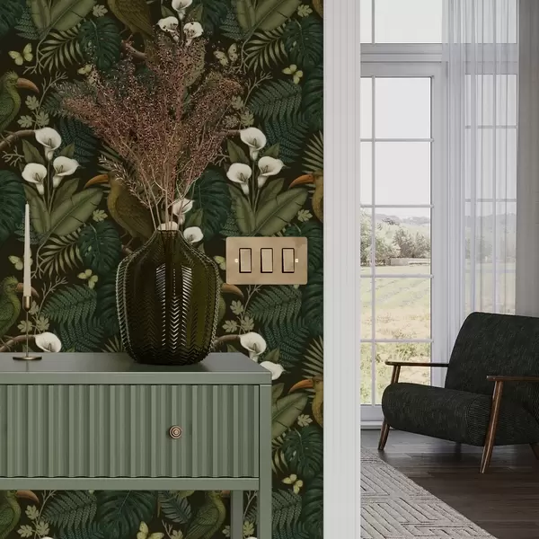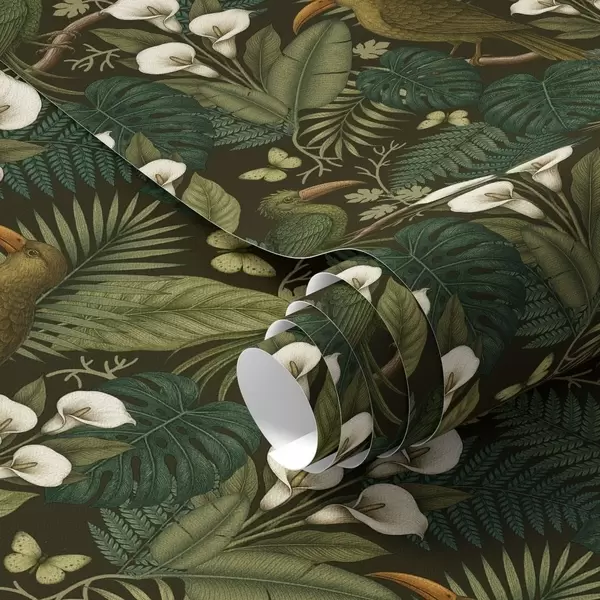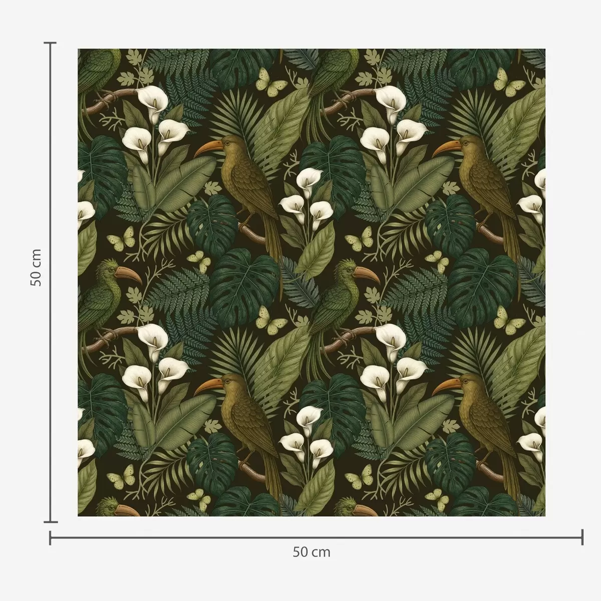 Тапет Тропически птици и буйна зеленина на тъмен фон в джунглата Nr. a00397
