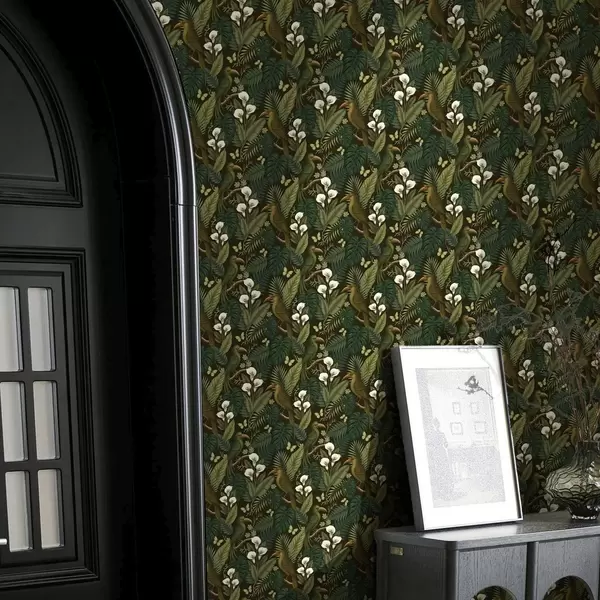 Тапет Тропически птици и буйна зеленина на тъмен фон в джунглата Nr. a00397
