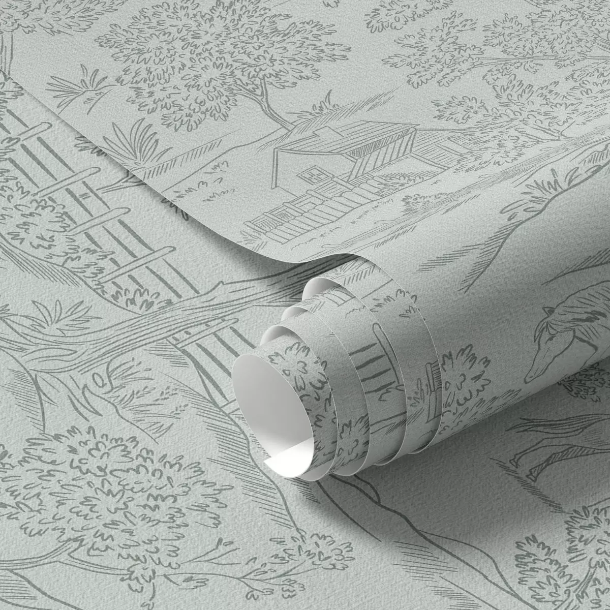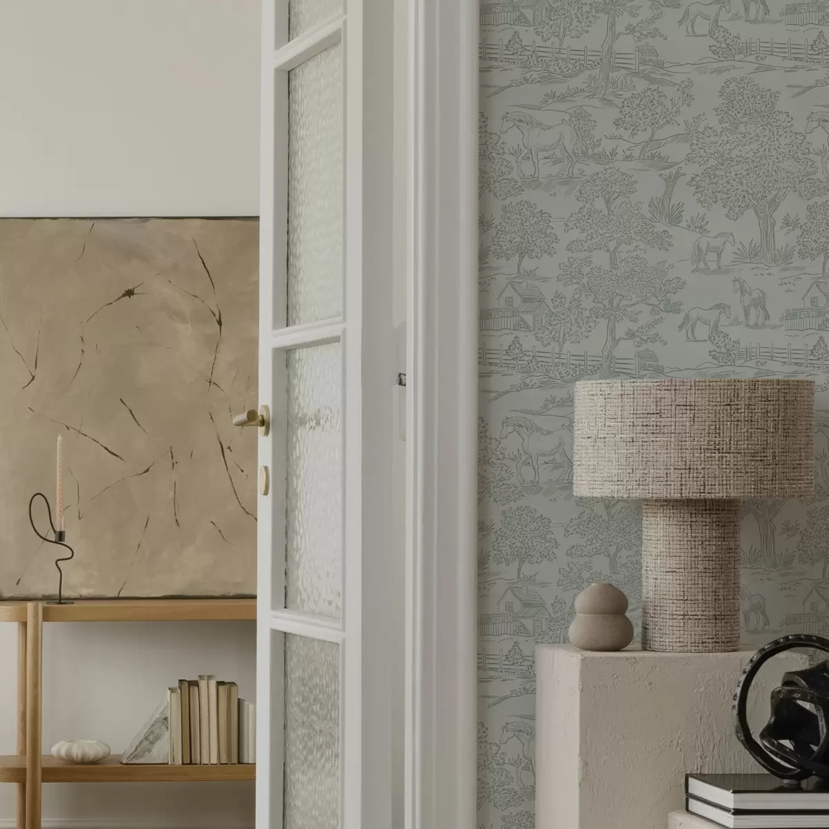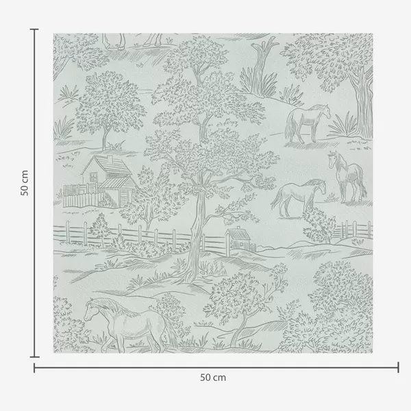 Тапет Зелен монохромен пейзаж с коне и къщички Nr. a00407