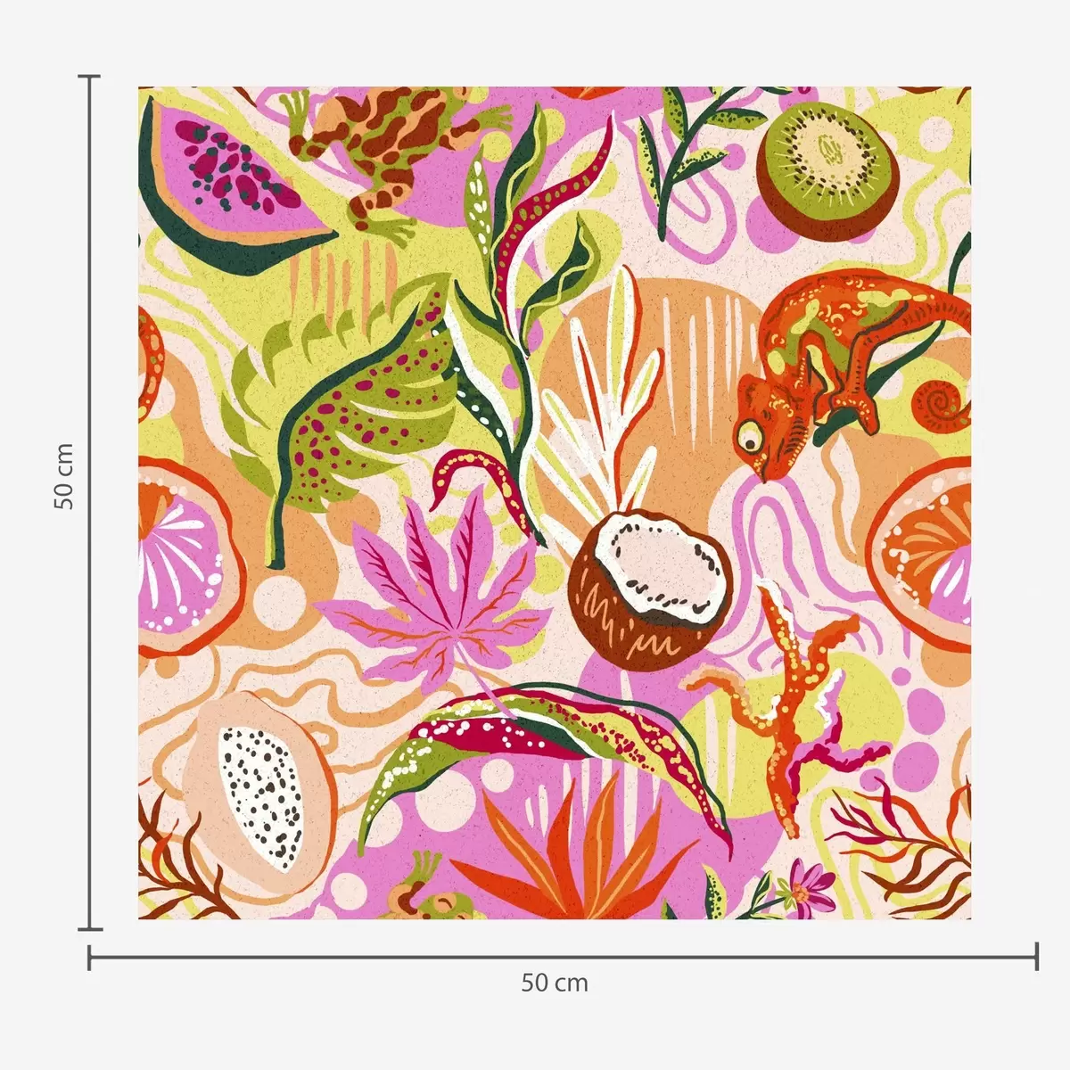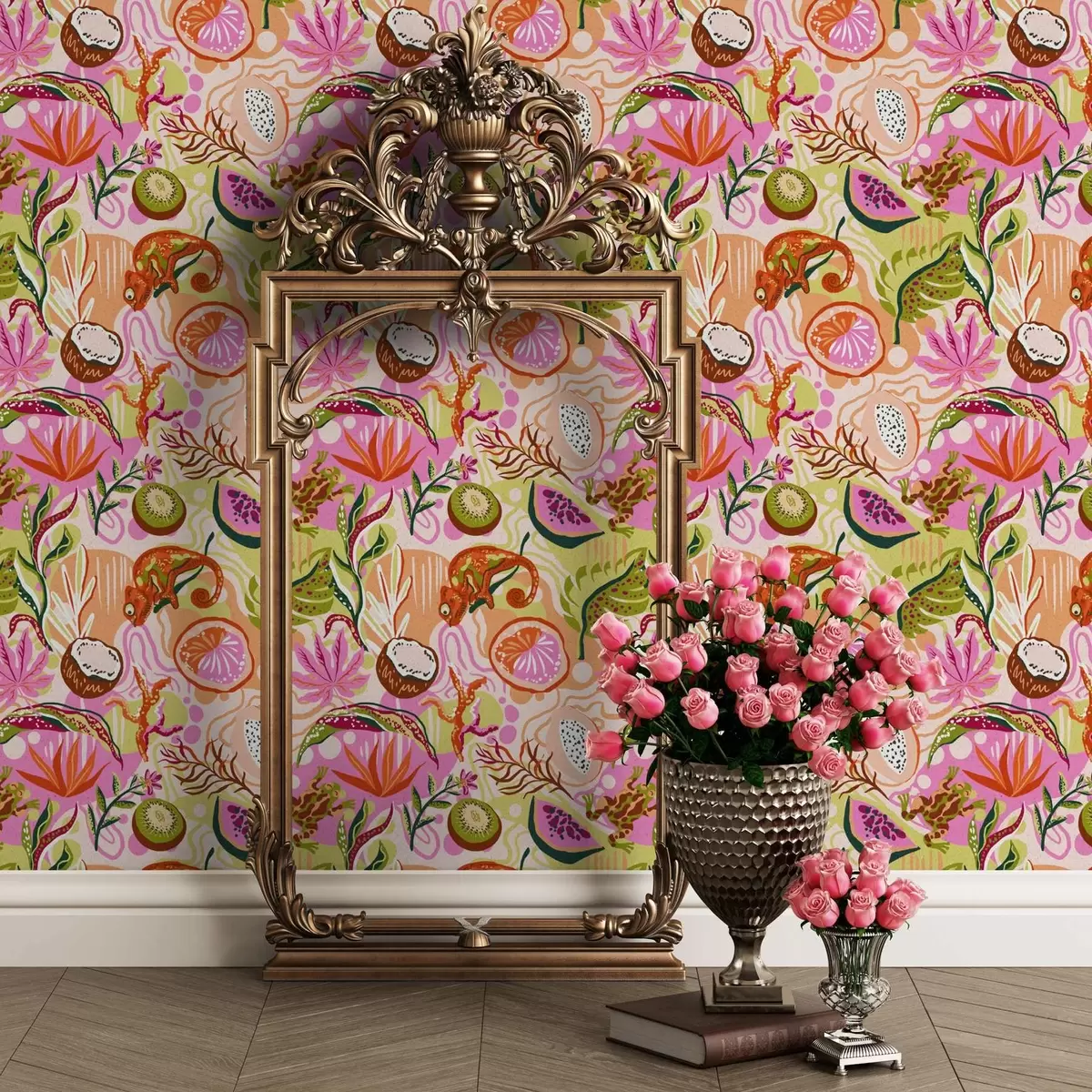 Тапет Екзотични плодове, листа и хамелеони в тропически стил Nr. a00469