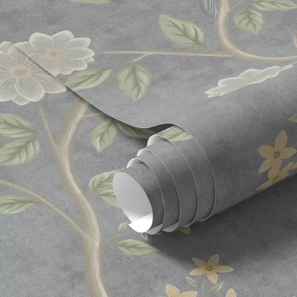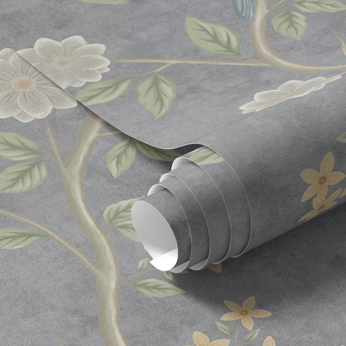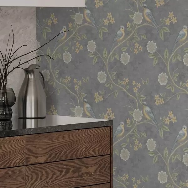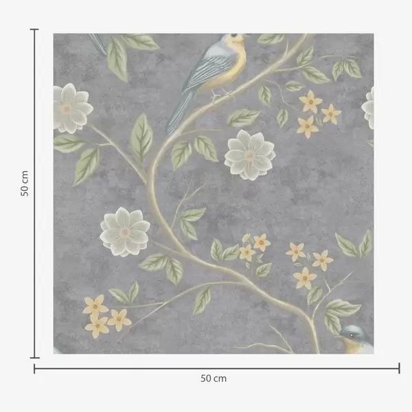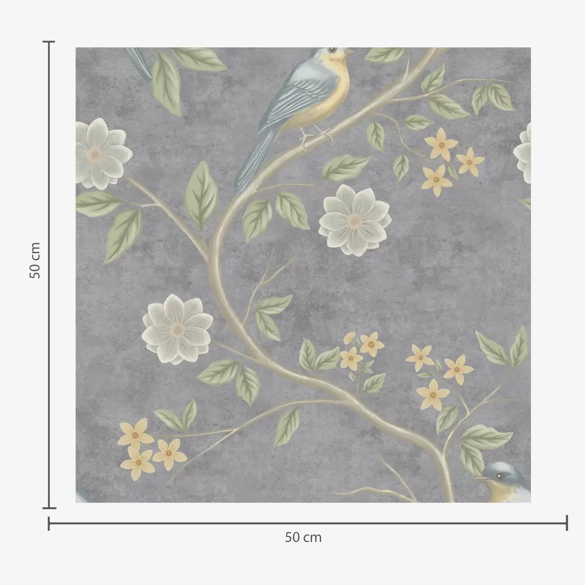 Тапет Птици върху клони сред цветя на сив фон Nr. a00483