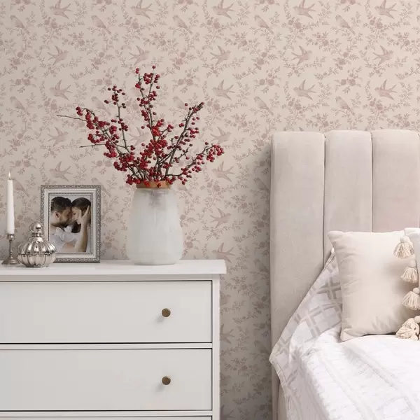 Тапети Птици и рози, ретро мотив върху прахово розово a00587